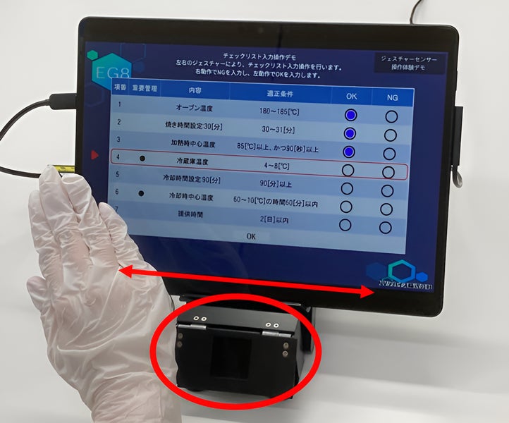 非接触で手の動きで画面操作を行います。画面の拡大縮小や、360℃回転、上下左右のスライド操作が可能です。また、数値入力やデータ管理が行えるため、デジタル化やペーパーレス化にも貢献します。