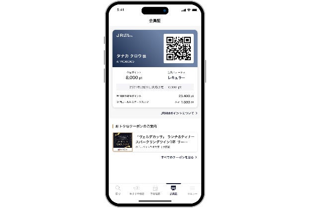 会員証画面でJRホテルメンバーズのポイント情報や会員ステータス、お気に入りホテルからのおトクなクーポンなど、JRホテルメンバーズをおトクにご利用いただける情報を一度にご確認いただけます。