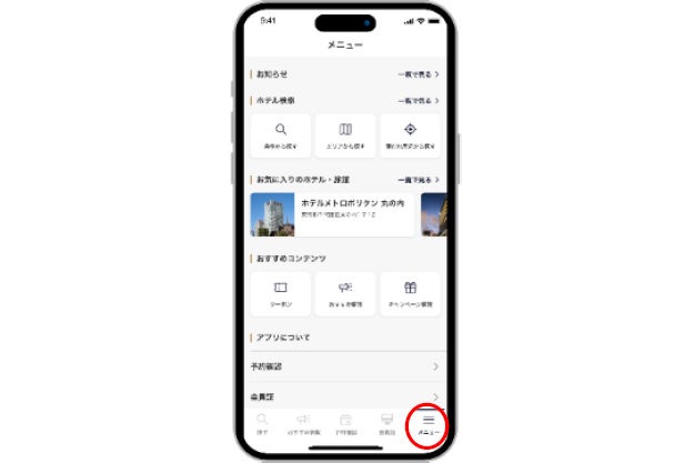 フッターメニューに新たに「メニュー」ボタンが追加されました。宿泊予約から登録情報の変更など、アプリの機能が集約されています。