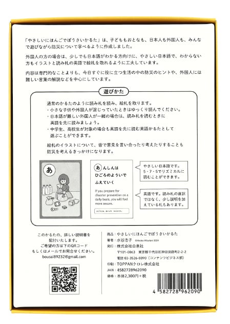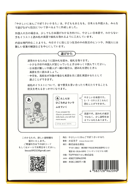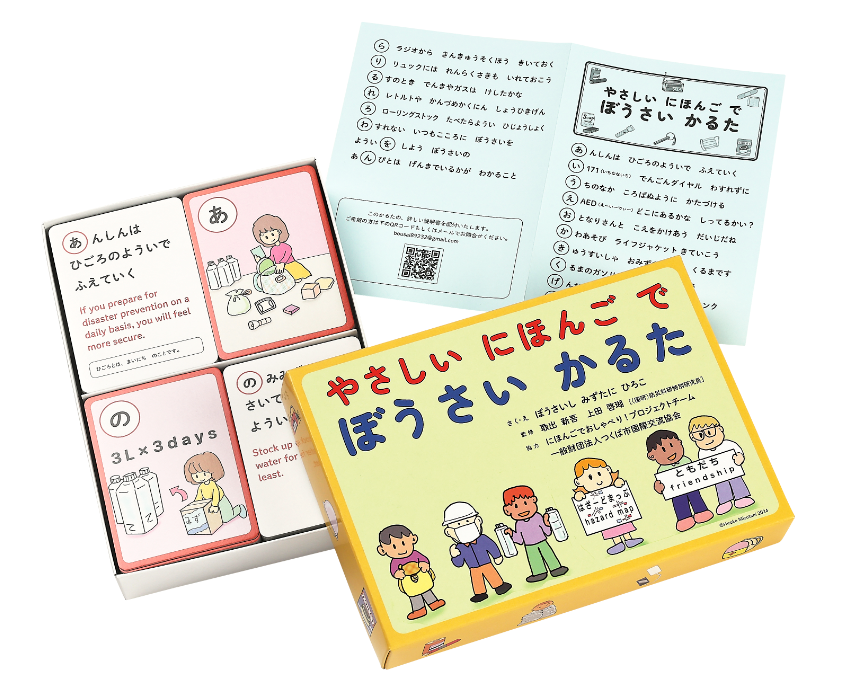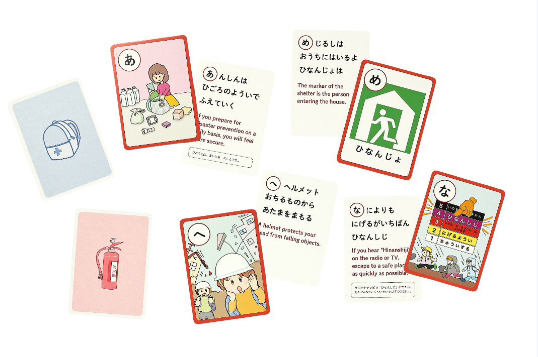 読み札がやさしい日本語と英語で書かれているので、子どももおとなも、日本人も外国人も、みんなで遊びながら防災について学べるかるたです。