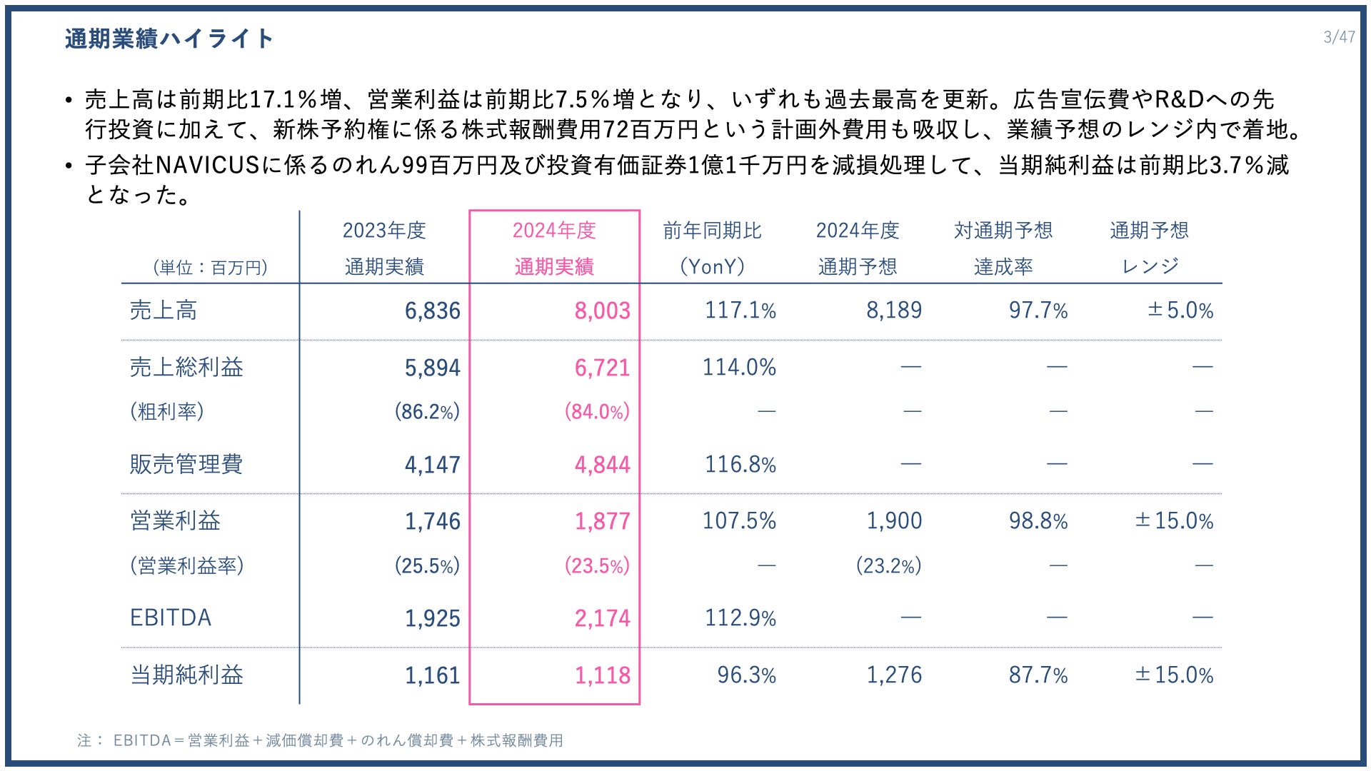 子会社NAVICUSに係るのれん9900万円及び投資有価証券1億1000万円を減損処理して、当期純利益は前期比3.7%減となりました。なお、今回の通期決算より、決算説明資料と決算短信にEBITDAを記載し、今後は営業利益に加えてEBITDAも財務指標として重要視してまいります。