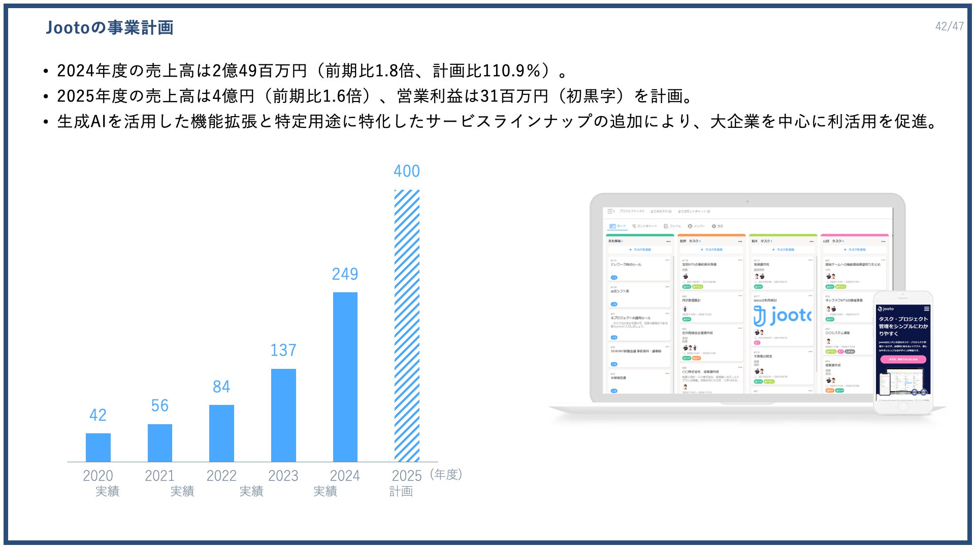 Jootoの事業計画について、2024年度の売上高は2億4900万円(前期比1.8倍、計画比110.9%)となりました。