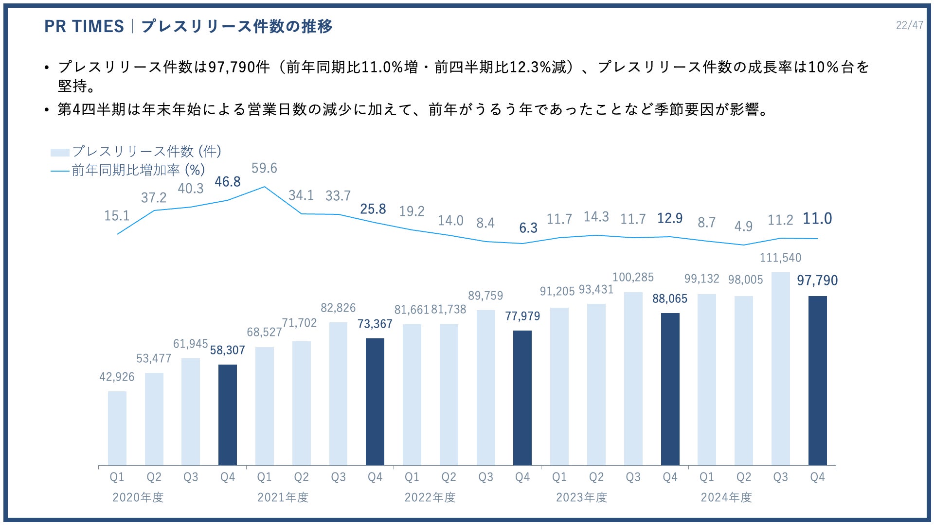 2024年度第4四半期は、9万7790件のプレスリリースを配信いただき、前年同期比で11.0%増、前四半期比で12.3%減となりました。プレスリリース件数の成長率は10%台を堅持しているものの、第4四半期は年末年始による営業日数の減少に加えて、前年がうるう年であったことなど季節要因が影響した結果となりました。