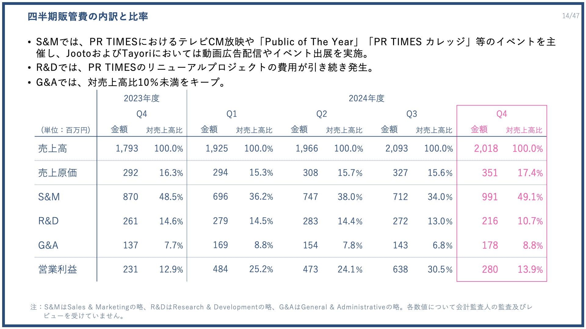 販売管理費についてご紹介いたします。S&M、R&D、G&Aで金額と対売上高比率を記載しています。