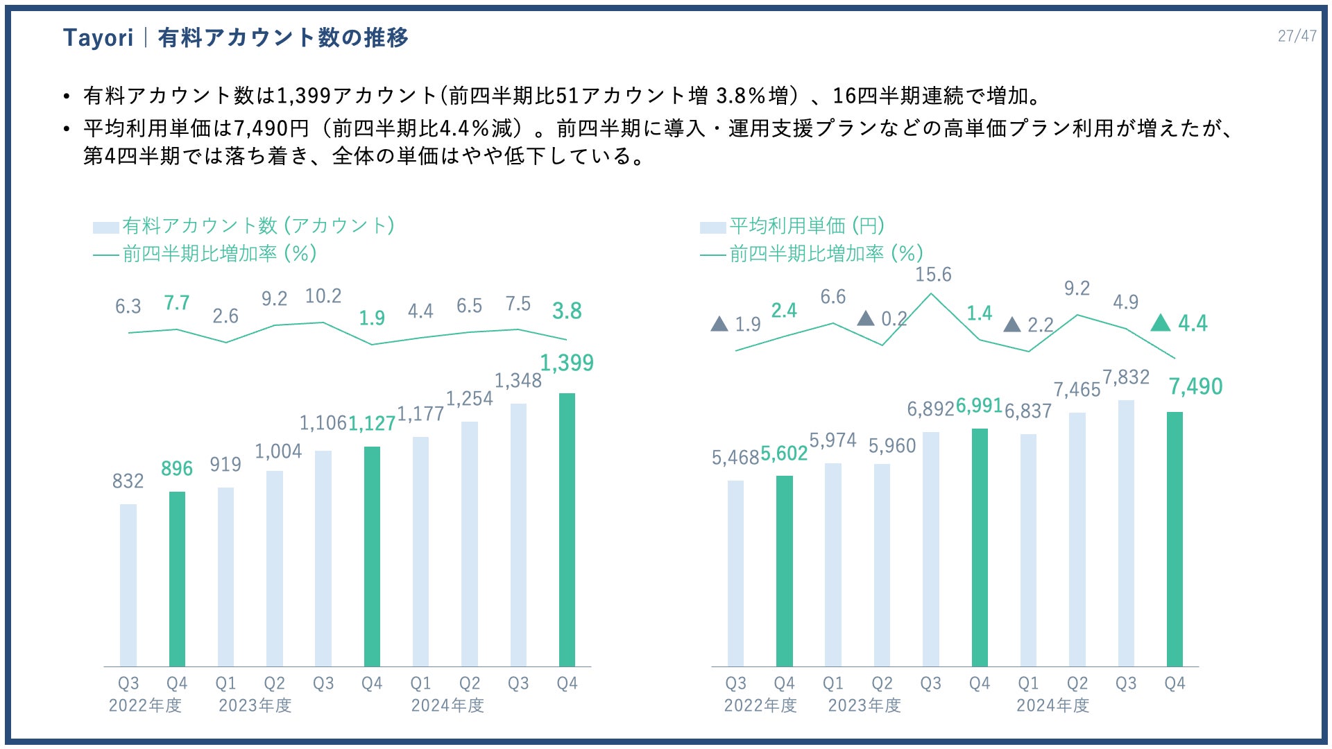 1アカウントあたりの平均利用単価は7490円で、前四半期には導入・運用支援プランなどの高単価プラン利用が増えていたため単価が上昇しましたが、第4四半期ではその動きが落ち着き、全体の単価はやや低下しております。