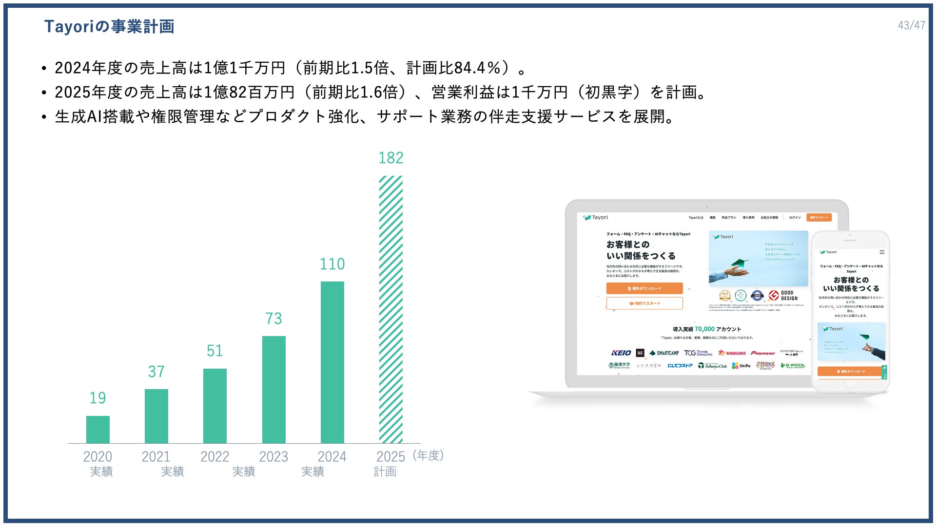 Tayoriの事業計画について、2024年度の売上高は1億1000万円(前期比1.5倍、計画比84.4%)となりました。
