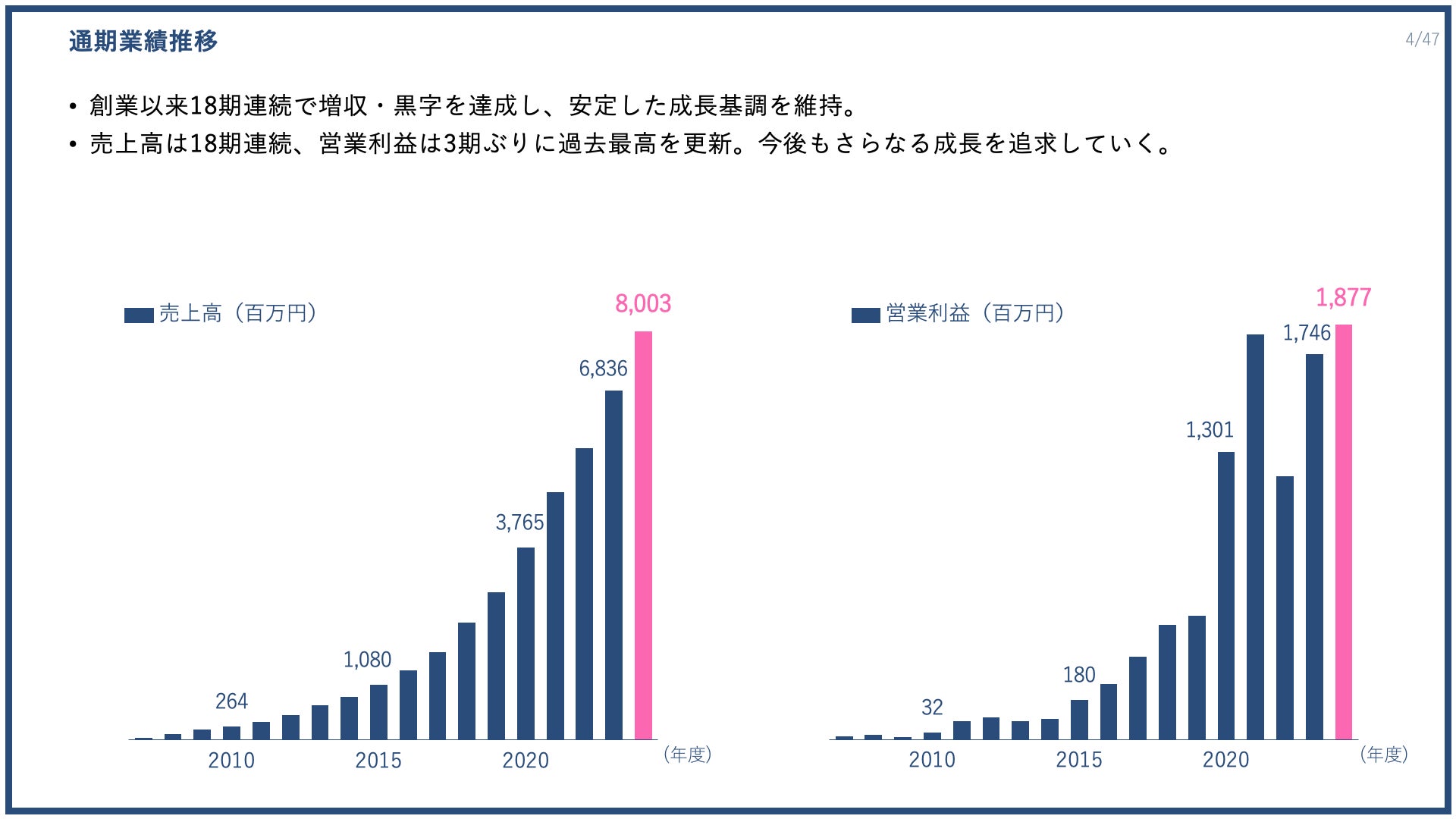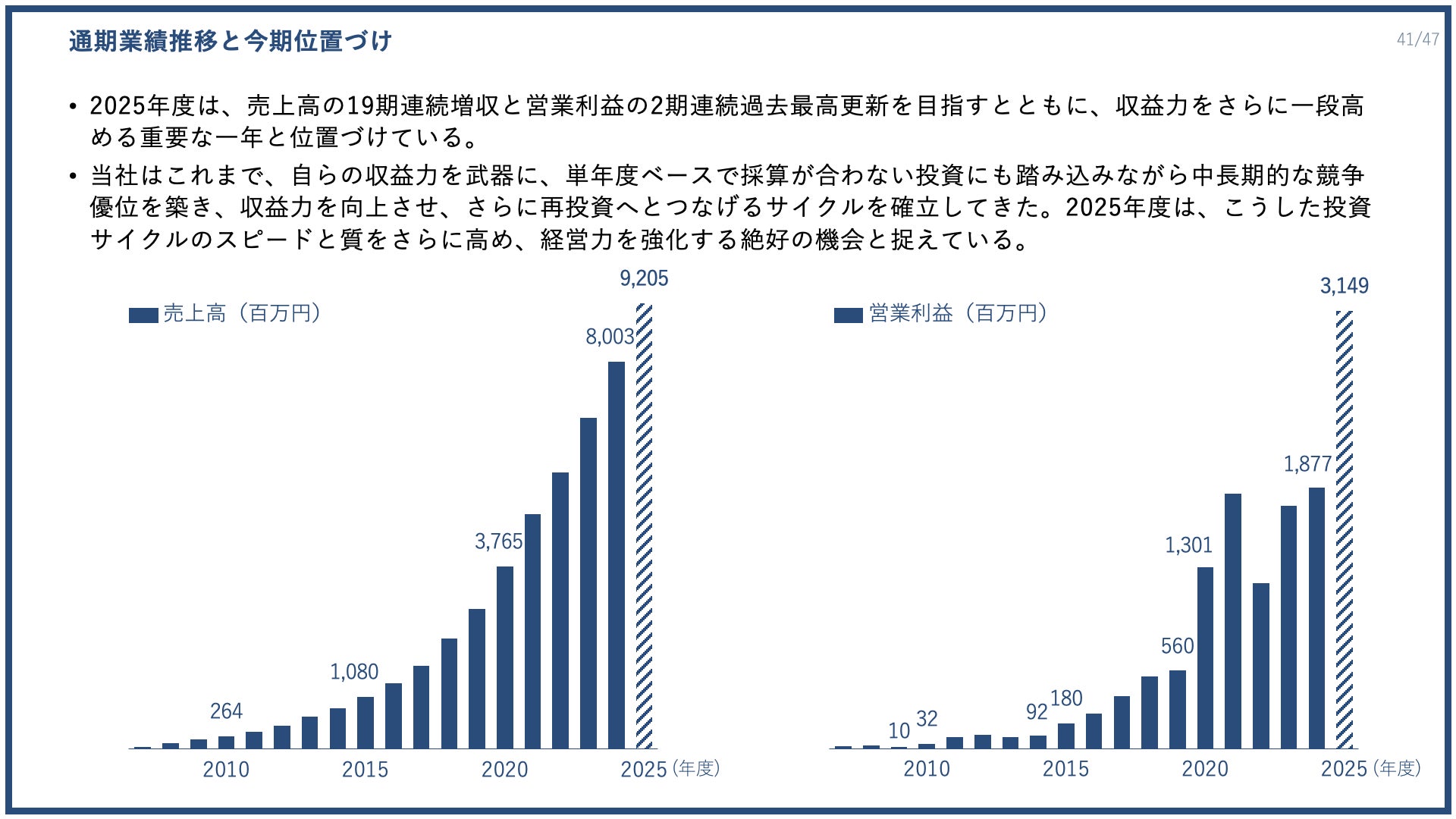 通期業績推移と今期位置づけについて、2025年度は売上高の19期連続増収と営業利益の2期連続過去最高更新を目指すとともに、収益力をさらに一段高める重要な一年と位置づけています。当社はこれまで、自らの収益力を武器に、単年度ベースで採算が合わない投資にも踏み込みながら中長期的な競争優位を築き、収益力を向上させ、さらに再投資へとつなげるサイクルを確立してきました。2025年度は、こうした投資サイクルのスピードと質をさらに高め、経営力を強化する絶好の機会と捉えています。