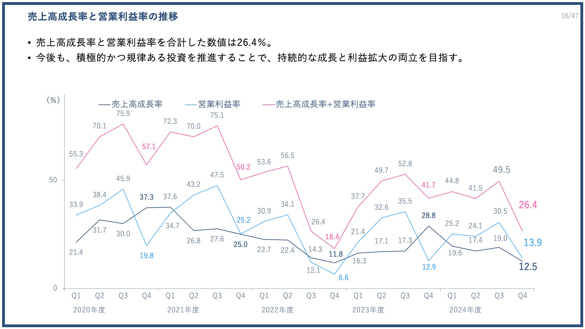 売上高成長率と営業利益率の合計は26.4%となりました。当社では、今後も積極的かつ規律ある投資により、事業成長と利益向上の両立を目指す方針です。