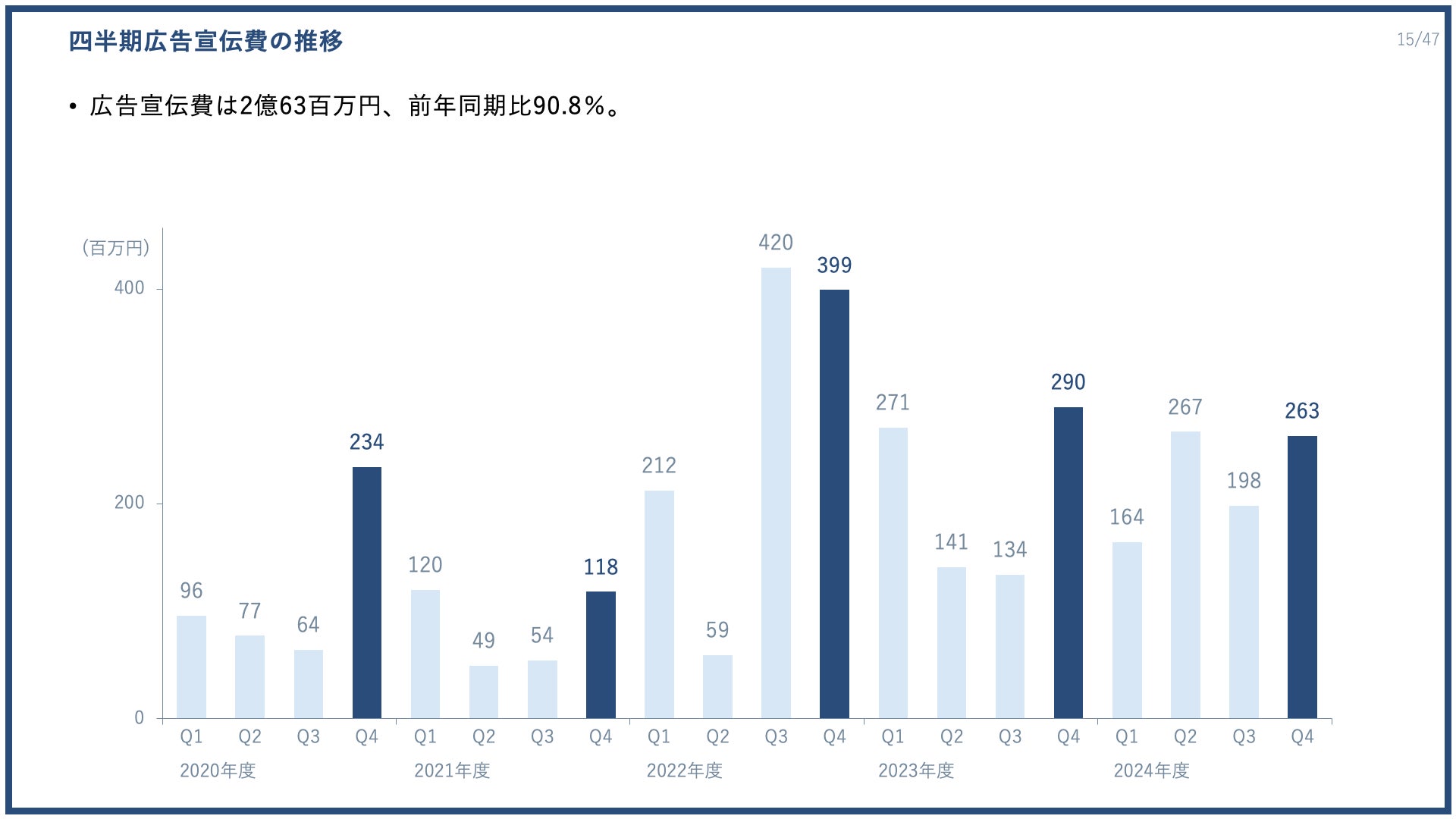 また、S&Mの中の広告宣伝費について、第4四半期は2億6300万円と前年同期比で90.8%となりました。