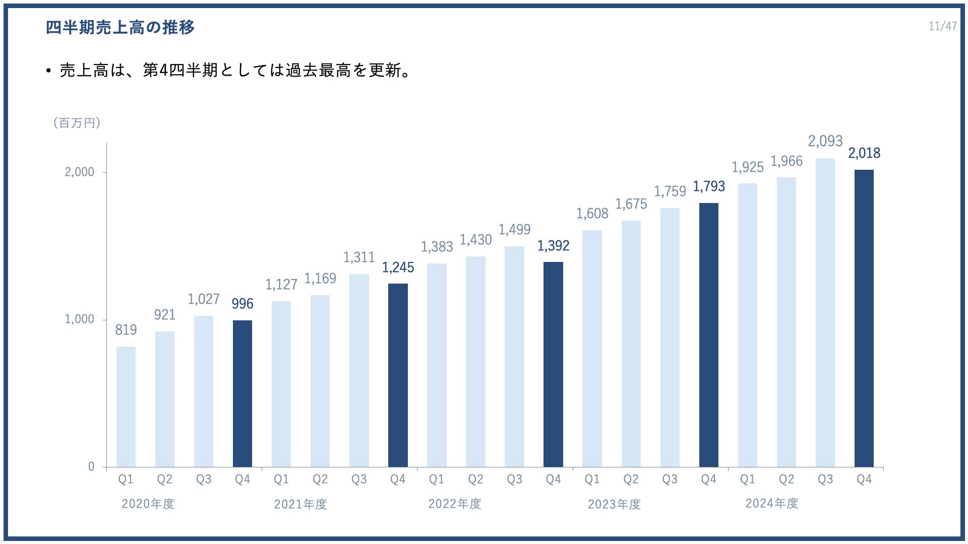 四半期売上高の推移では、堅調に成長基調を継続しているのがご確認いただけます。四半期売上高は、第4四半期としては過去最高を更新しました。