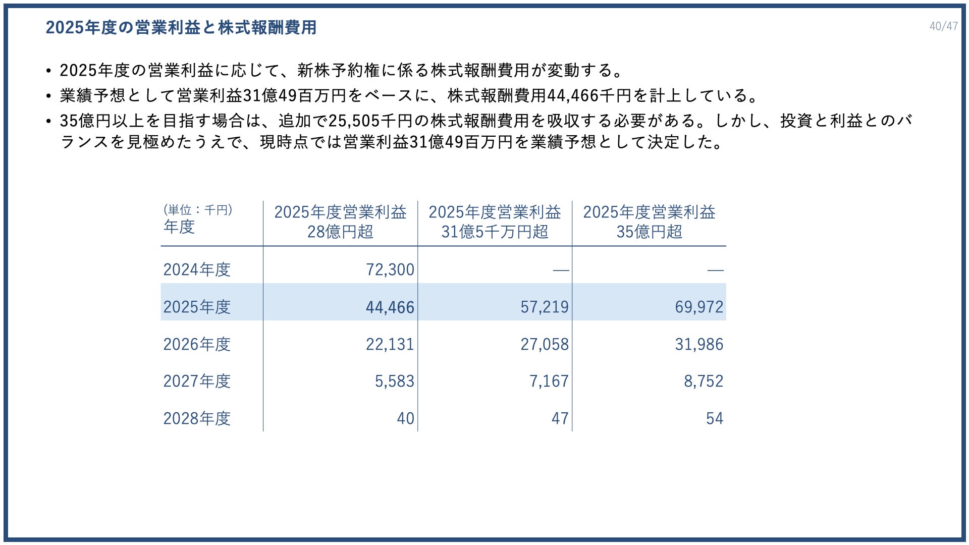続いて、2025年度の営業利益と株式報酬費用についてです。2025年度の営業利益に応じて、新株予約権に係る株式報酬費用が変動しますが、業績予想として営業利益31億4900万円をベースに、株式報酬費用4446万6000円を計上しています。35億円以上を目指す場合は、追加で2550万5000円の株式報酬費用を吸収する必要がありますが、投資と利益とのバランスを見極めたうえで、現時点では営業利益31億4900万円を業績予想として決定しました。