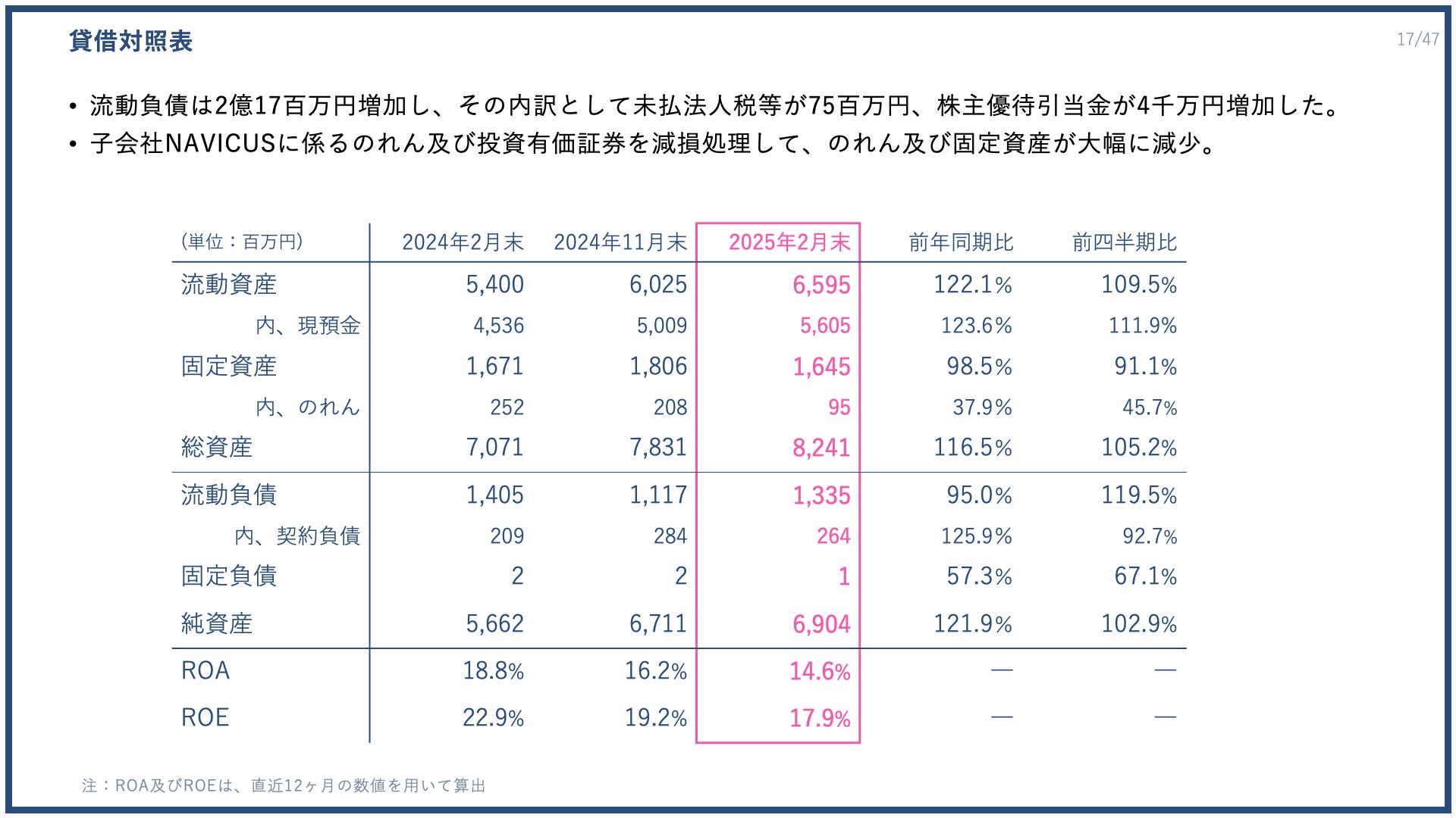 バランスシートについて、流動負債は2億1700万円増加しました。内訳としては、未払法人税等が7500万円、株主優待引当金が4000万円増加しました。また、子会社であるNAVICUSに対するのれんを減損したため、のれんの残高が前年同期比・前四半期比で大幅に減少しています。