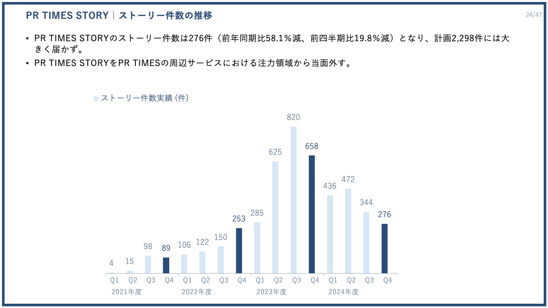 「PR TIMES」に関連したサービスラインで「PR TIMES STORY」をご紹介します。「PR TIMES STORY」のストーリー件数は276件で、前年同期比58.1%減、前四半期比19.8%減と、計画2298件に対して大幅な未達となりました。「PR TIMES STORY」を「PR TIMES」の周辺サービスにおける注力領域から当面外す方針としています。