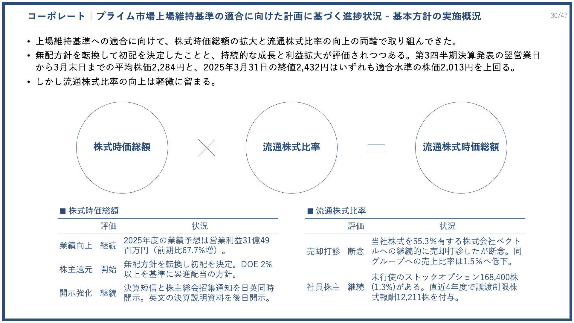 無配方針を転換して初配を決定したことと、持続的な成長と利益拡大が評価されつつあり、第3四半期決算発表の翌営業日から3月末日まで平均株価2284円と、2025年3月31日の終値2432円はいずれも適合水準の株価2013円を上回っています。一方で、流通株式比率の向上は軽微に留まっています。