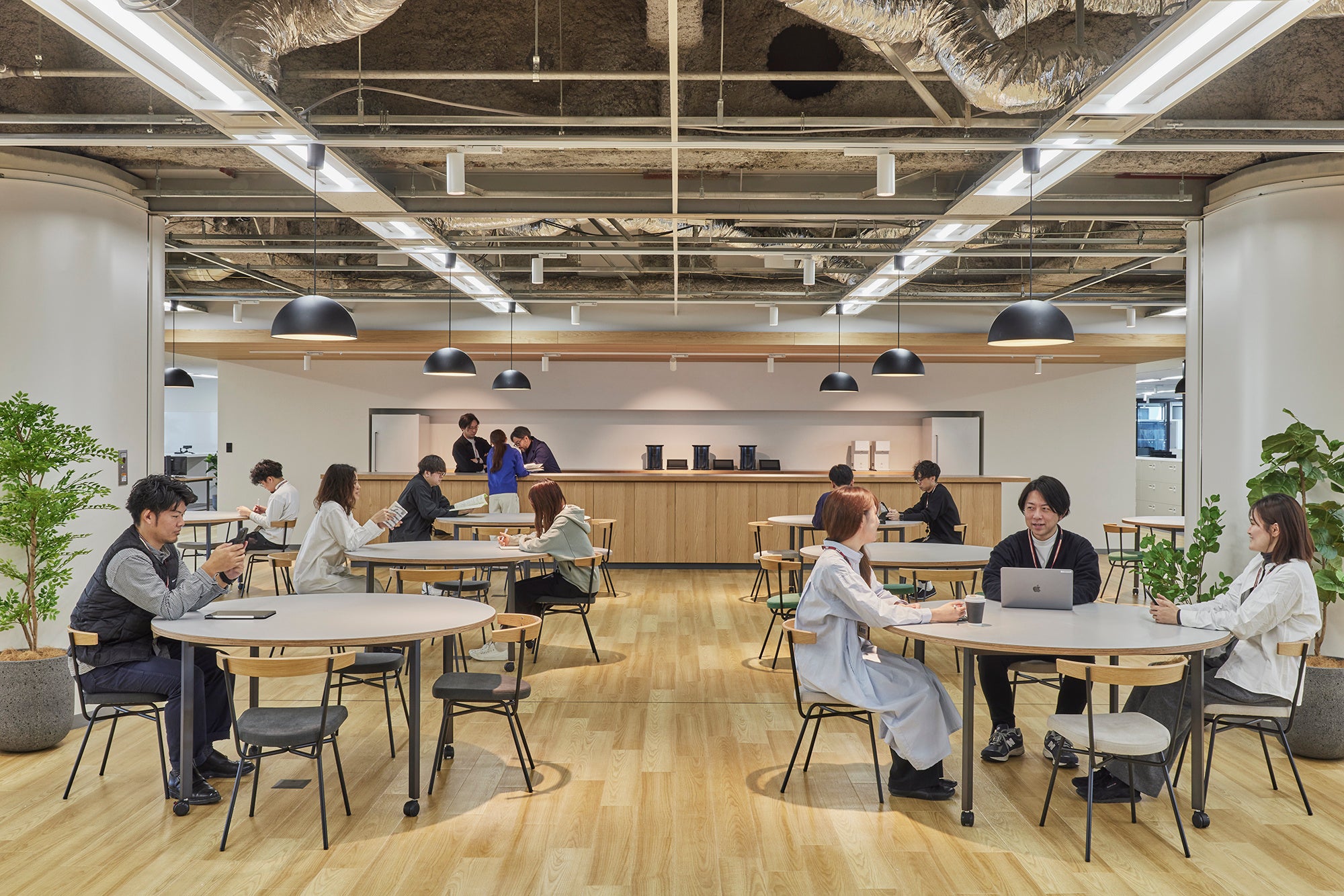 ・5Fフロア中央に社員用オープンスペースを設置。通常は社員の休憩や交流の場として利用できるほか、社内イベントや試食会などを実施し、コミュニケーションを促進します。