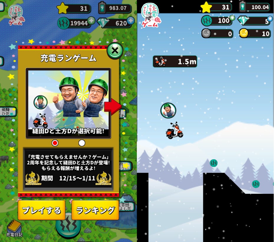 ミニゲームである「充電ランゲーム」では 、昨年に続いて2周年を記念する横断幕が出現中。また、ステージも12月は雪景色のクリスマスバージョン、1月は神社の鳥居などが拝めるお正月バージョンに変化します。ぜひ限定ステージをチェックしてください!