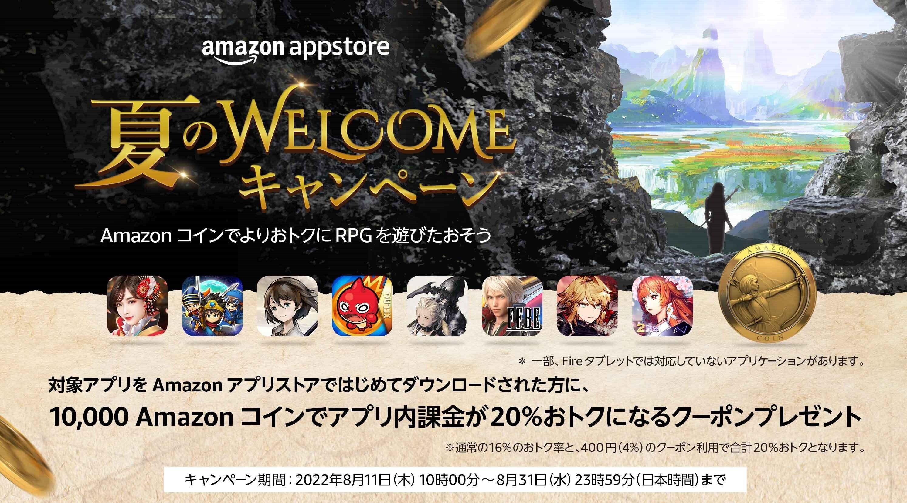 Amazonは、2022年8月11日(木)夏のホリデーシーズン中に、Amazonアプリストアで配信されている対象のRPGアプリをよりお得に楽しめる、【夏のWELCOMEキャンペーン】を開始いたします。本キャンペーンでは、対象アプリをAmazonアプリストアにて初めてダウンロードしたお客様を対象に、通常8,400円の10,000 Amazonコインが8,000円で購入できるクーポンをプレゼントいたします。Amazonコインとは、Android端末やFireタブレットのAmazonアプリストアで配信しているアプリの課金に利用できる専用通貨です。1コインは1円以下で購入ができ、1コインは1円相当として課金に使えます。