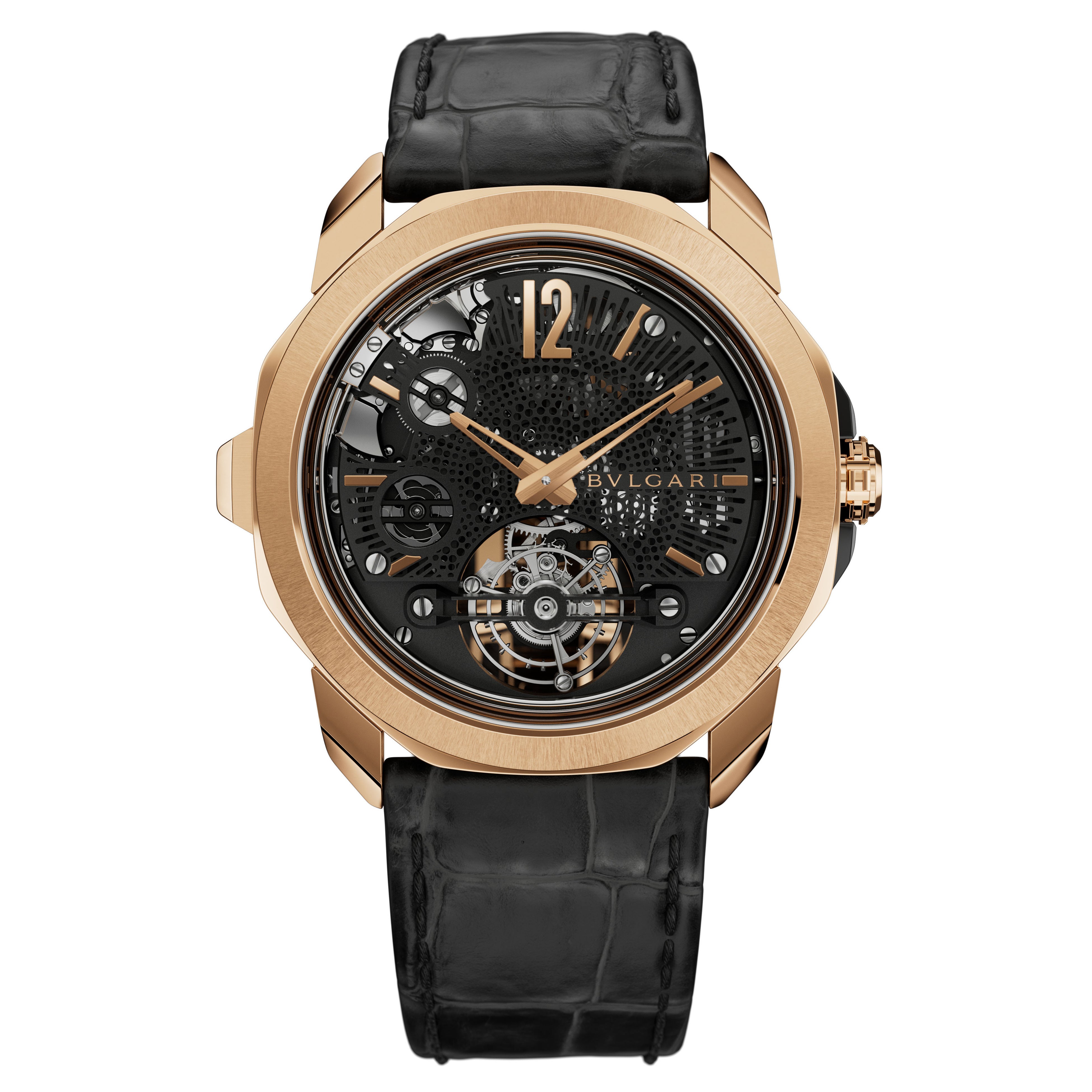 品番:103933 価格:要問合せ ムーブメント:BVL428、オープンワークブリッジマニュファクチュールムーブメント、手巻き、ミニッツリピーター、3ハンマーカリヨン、トゥールビヨン、パワーリザーブインジケーター、毎時21,600振動、約75時間パワーリザーブ ケース/ダイヤル:径44mm、厚さ12.60mm、サテンポリッシュ仕上げを施したピンクゴールド製ケース、ブラックセラミックをあしらいサテンポリッシュ仕上げを施したピンクゴールド製リューズ、サテンポリッシュ仕上げを施したピンクゴールド製プッシュボタンシースルーケースバック、30m防水、サンドブラスト仕上げを施したブラックDLC加工真ちゅう製オープンワークダイヤル、ポリッシュ加工のピンクゴールド製針とインデックス ストラップ:ブラックアリゲーターストラップ、サテンポリッシュ加工ピンクゴールド製フォールディングバックル