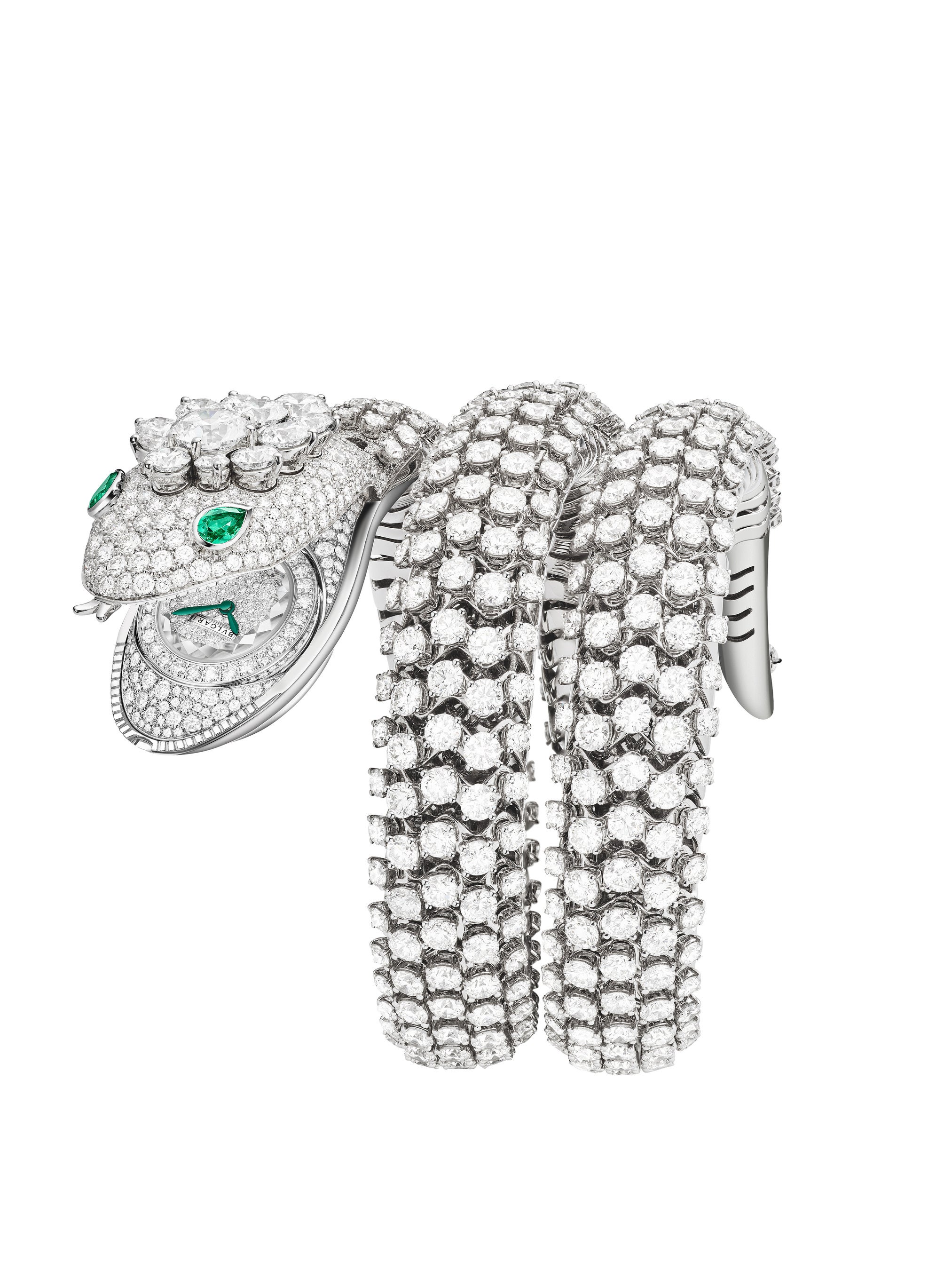 品番:104025 価格:要問合せ ムーブメント:BVL100、ピコリッシモキャリバー、手巻き、機械式マイクロ ムーブメント、ムーブメント厚さ2.55mm、約30時間パワーリ ザーブ、毎時21,600振動 ケース/ダイヤル/ブレスレット:ホワイトゴールド製、ラウンドブリリアンカットダイヤモンド(66.31ct)と2石のペアシェイプエメラルド(約0.47ct)をセットしたダブルツアーブレスレット、グリーンの針をあしらったパヴェダイヤモンド(約0.28ct)のダイヤル