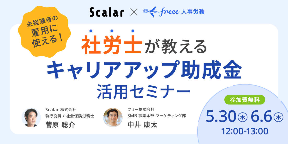 社労士であるScalar株式会社の菅原執行役員とfreee SMB事業本部の中井康太が登壇し、5月30日(木)と6月6日(木)にオンラインセミナーを開催します。
