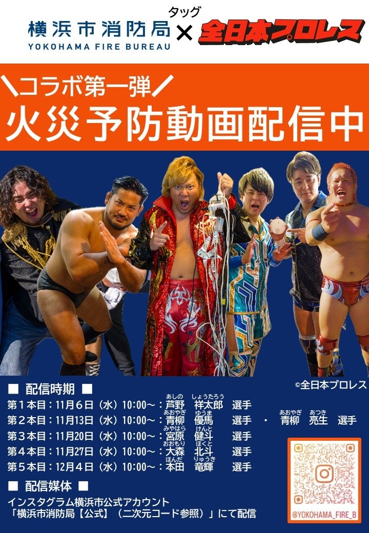 第一弾では、全日本プロレスの選手たちが火災予防の重要なポイントを紹介するショート動画をインスタグラムにて配信します。