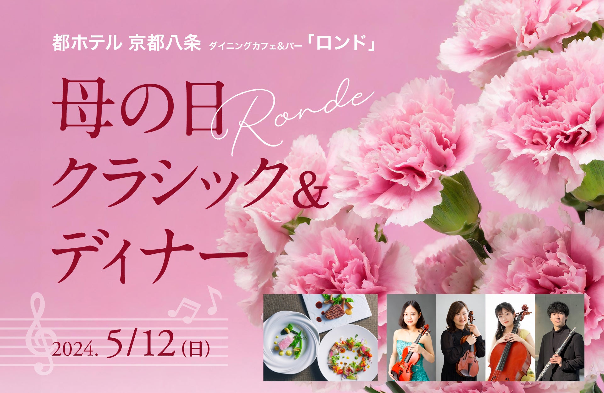 都ホテル 京都⼋条(所在地:京都市南区⻄九条院町17)は、2024年5⽉12日(日)の母の日に、ダイニングカフェ&バー「ロンド」にて『母の日 クラシック&ディナー』を開催します。京都市立芸術大学音楽学部の学生によるクラシックの生演奏と、この日のためにロンドシェフ益が腕によりをかけたスペシャルディナーをお楽しみいただける一夜限りのイベントです。大切なお母さまへの日頃の愛と感謝とともに、一緒に素敵な時間を過ごされてみてはいかがでしょうか