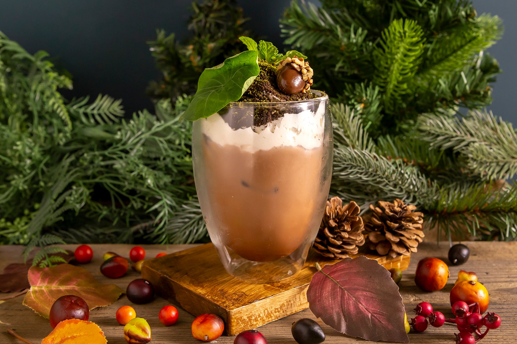 ココアクッキーと抹茶パウダーで森を表現したココア。葉っぱの傘とお礼の木の実が特別な思い出に。