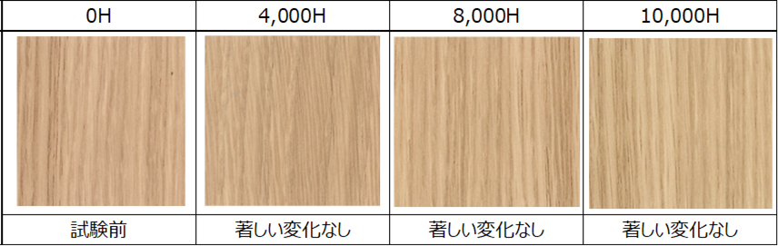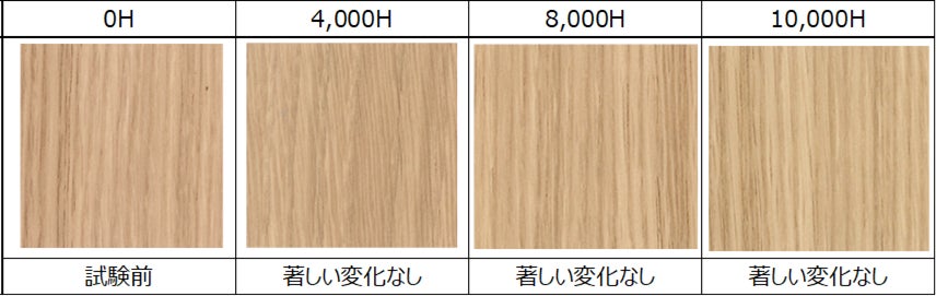 本製品は、耐候性能を付与した処方で設計されているため、従来の塩ビ化粧シートよりも大きく耐候性能が向上しています(当社比)。サンシャインウェザーメーター(SWOM)試験※1において、10,000時間にて著しい変化がないことを確認しています。