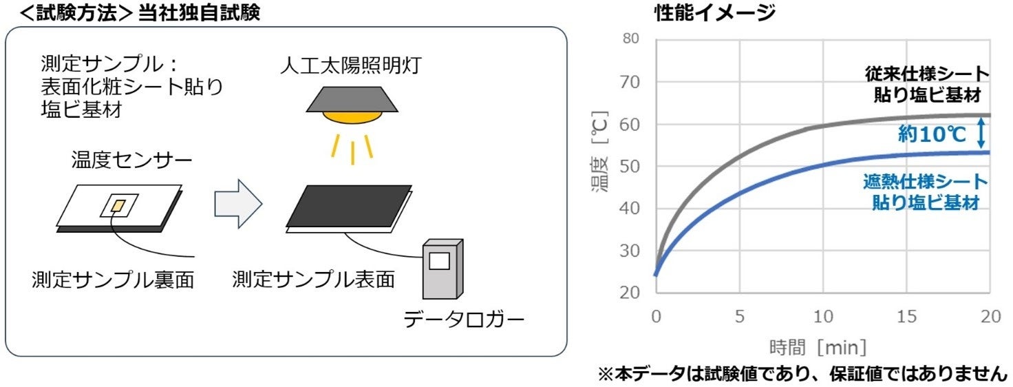 当化粧シートは、遮熱性能の追加を予定しています。独自技術により赤外線反射率を高め、濃色であっても熱を吸収しづらく、通常品と比較し、約10℃の温度上昇抑制効果を確認しました。(当社独自試験による)遮熱性能を追加したサンプルは2025年3月に提供開始予定です。