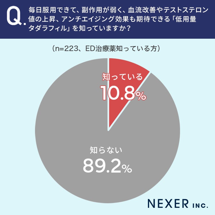 続いて、毎日服用できて副作用が弱く、血流改善やテストステロン値の上昇、アンチエイジング効果も期待できる「低用量タダラフィル」を知っているか聞いてみました。