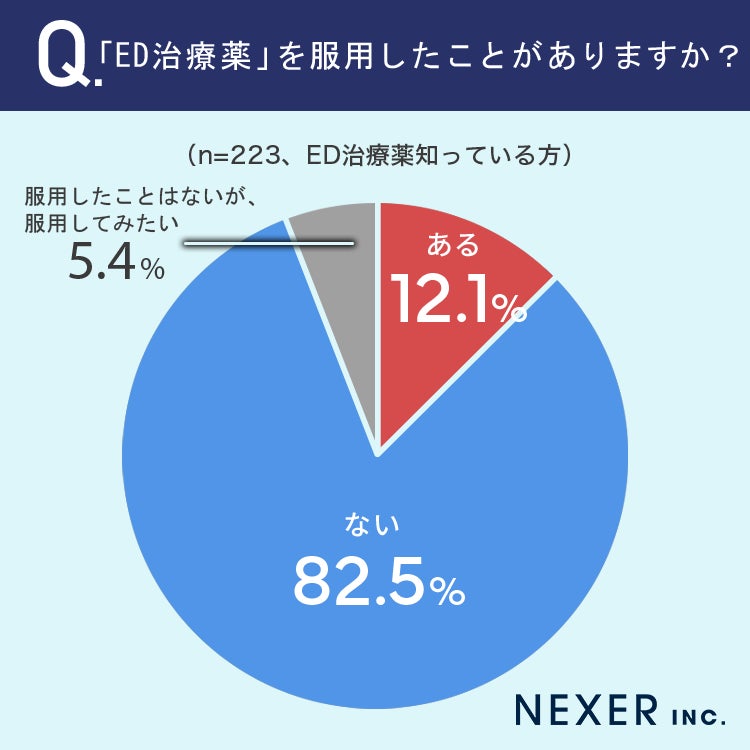 12.1%の方がED治療薬を服用したことが「ある」、5.4%の方が「服用したことはないが、服用してみたい」と回答しています。