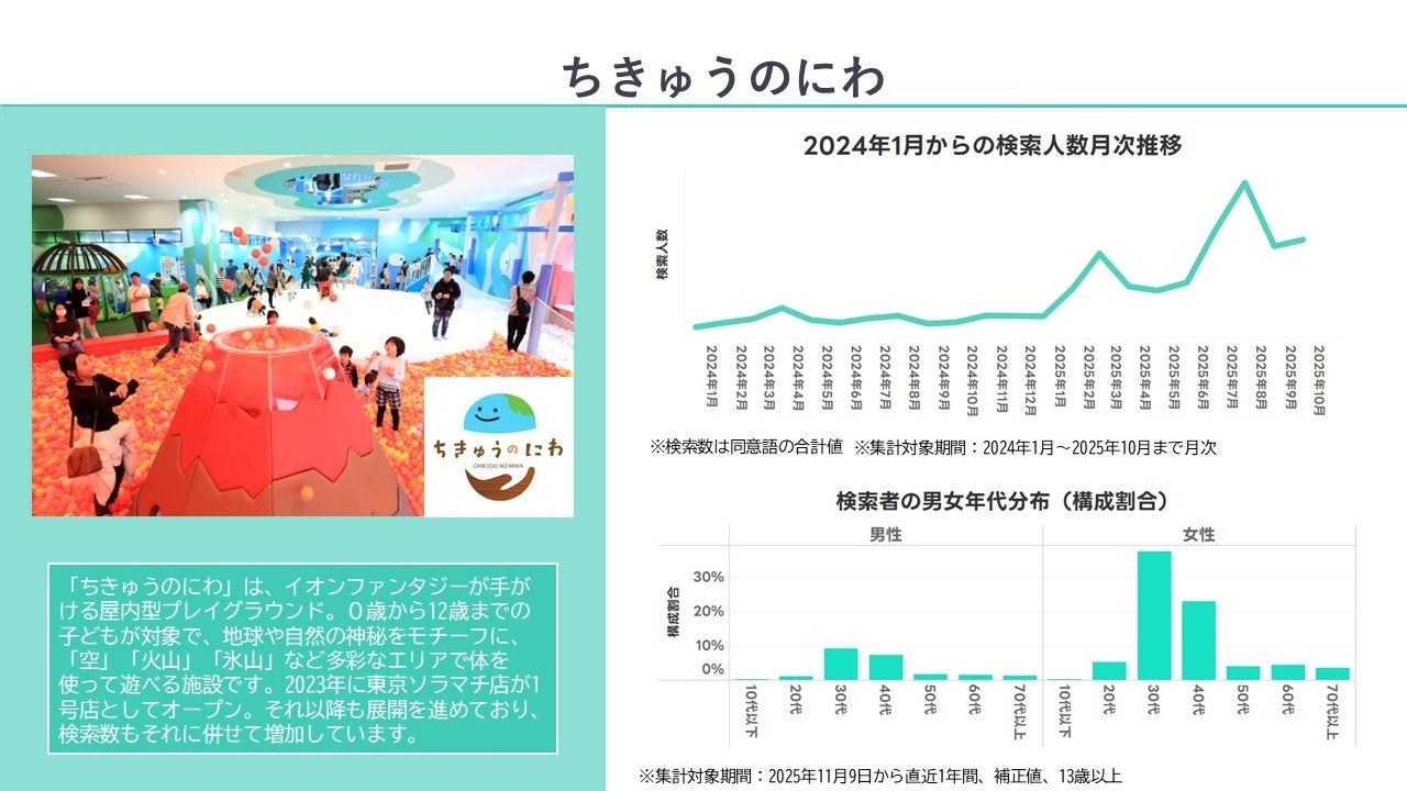 「ちきゅうのにわ」は、イオンファンタジーが手がける屋内型プレイグラウンド。0歳から12歳までの子どもが対象で、地球や自然の神秘をモチーフに、「空」「火山」「氷山」など多彩なエリアで体を使って遊べる施設です。2023年に東京ソラマチ店が1号店としてオープン。それ以降も展開を進めており、検索数もそれに併せて増加しています。