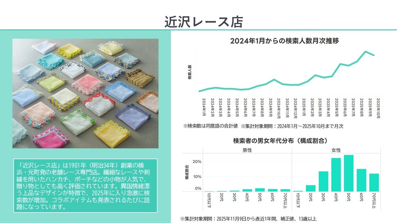 「近沢レース店」は1901年(明治34年)創業の横浜・元町発の老舗レース専門店。繊細なレースや刺繍を用いたハンカチ、ポーチなどの小物が人気で、贈り物としても高く評価されています。異国情緒漂う上品なデザインが特徴で、2025年に入り急激に検索数が増加。コラボアイテムも発表されるたびに話題になっています。