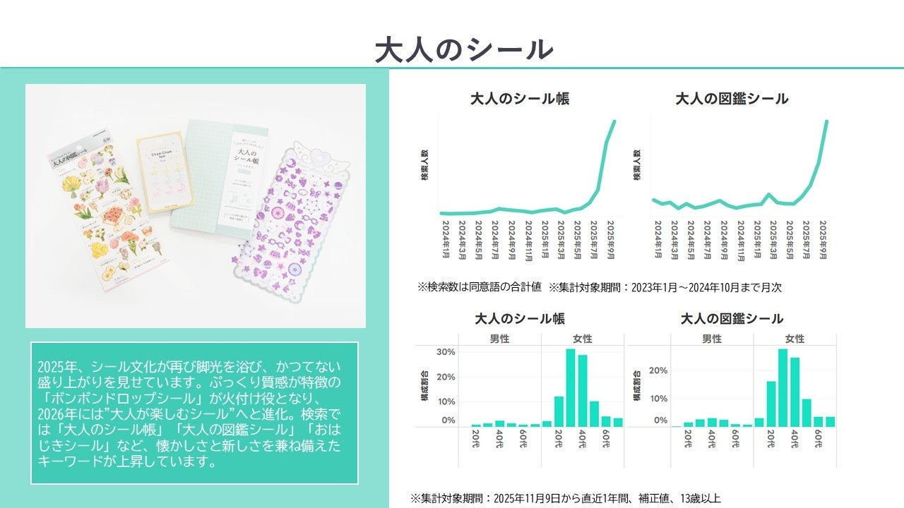 2025年、シール文化が再び脚光を浴び、かつてない盛り上がりを見せています。ぷっくり質感が特徴の「ボンボンドロップシール」が火付け役となり、2026年には"大人が楽しむシール"へと進化。検索では「大人のシール帳」「大人の図鑑シール」「おはじきシール」など、懐かしさと新しさを兼ね備えたキーワードが上昇しています。