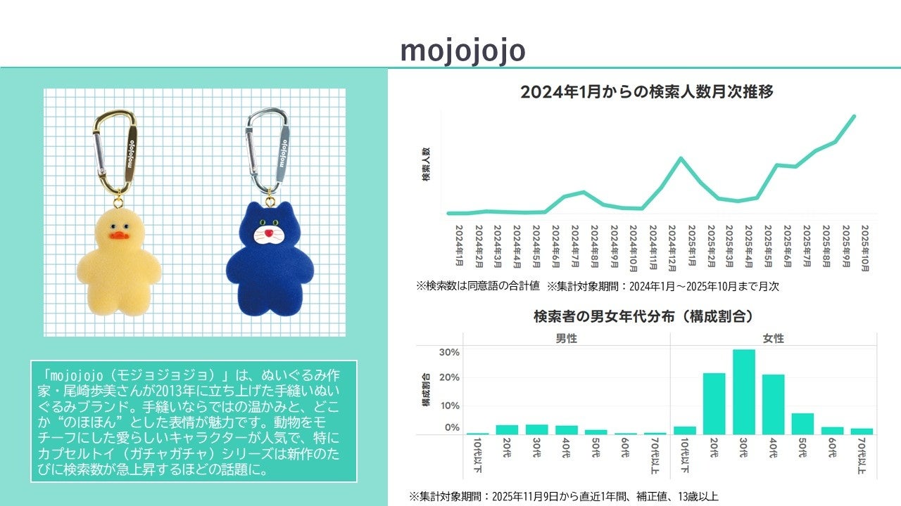 「mojojojo(モジョジョジョ)」は、ぬいぐるみ作家・尾崎歩美さんが2013年に立ち上げた手縫いぬいぐるみブランド。手縫いならではの温かみと、どこか“のほほん”とした表情が魅力です。動物をモチーフにした愛らしいキャラクターが人気で、特にカプセルトイシリーズは新作のたびに検索数が急上昇するほどの話題に。