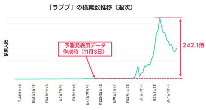 こうした取り組みの一環として、2022年末から次の年に流行することが期待される商品や事象を予測・解説したヒット予測レポートを公開しています。昨年発表したレポートにおいて、もっとも関心を集めたのはぬいぐるみの「ラブブ」です。ヒット予測モデルが予測した時点の検索数と比較して、最大で約240倍も増加するほどの上昇を見せるなど、ヒット予測モデルの可能性を改めて感じさせる結果となりました。