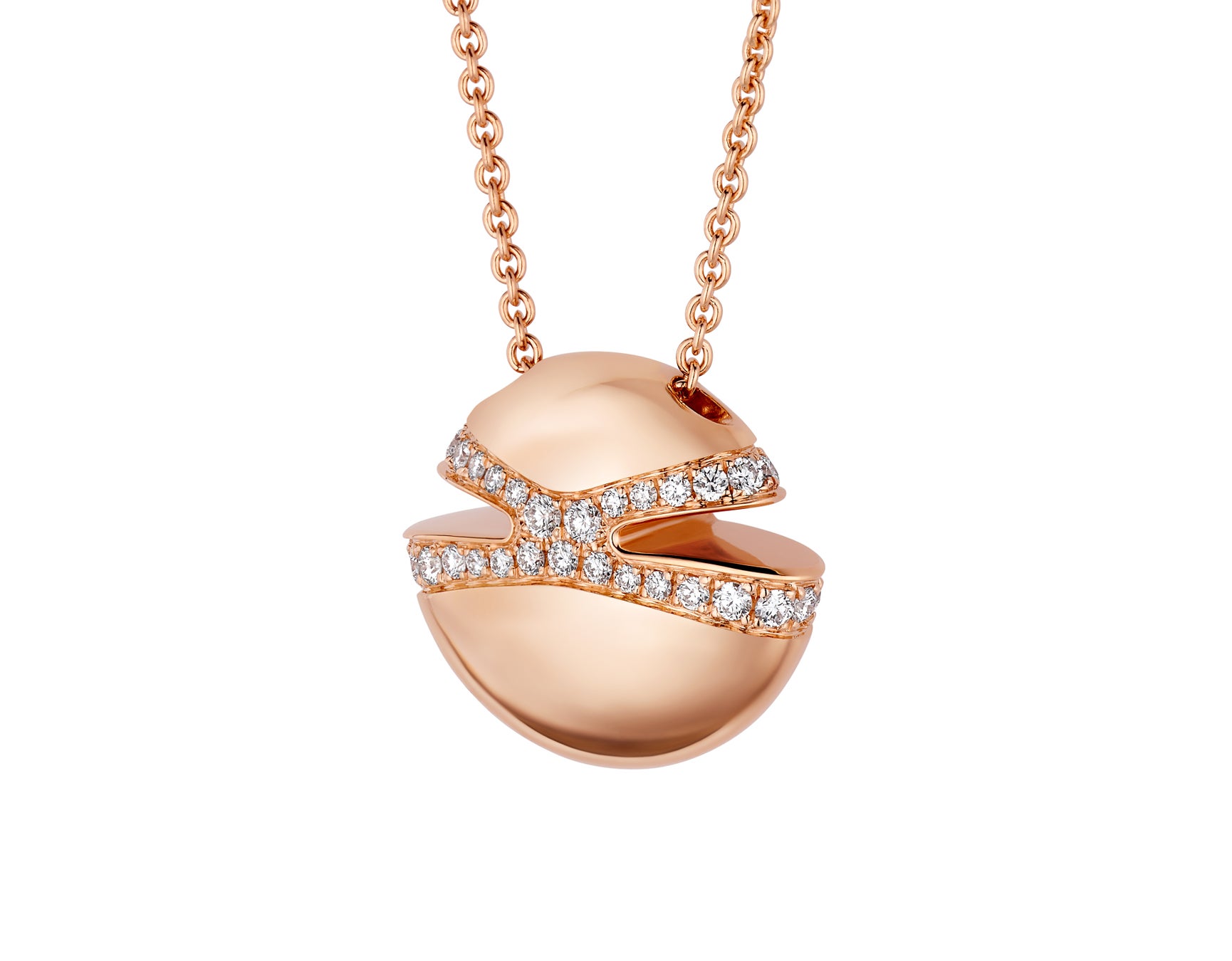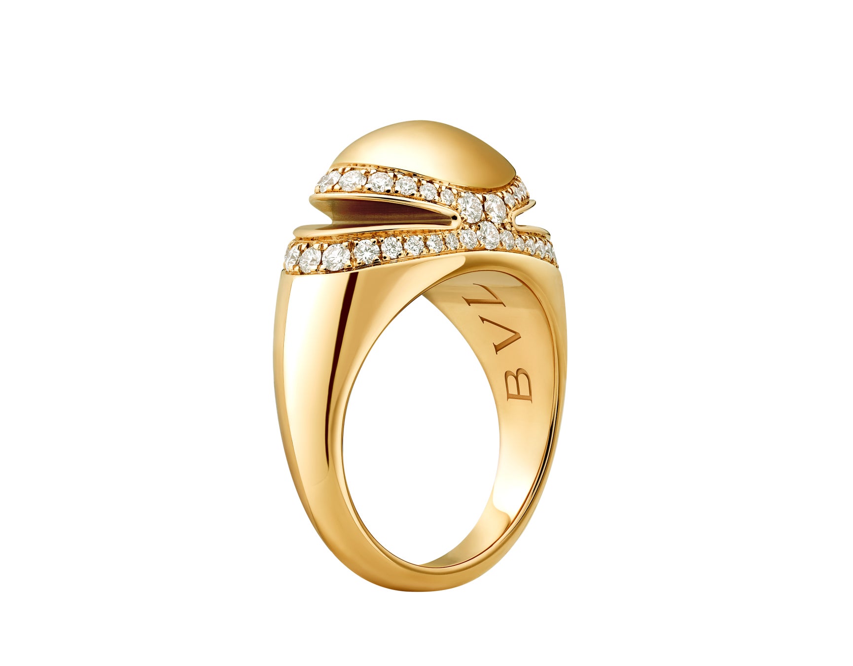 新作の2種類のネックレスとリングはいずれも18Kイエローゴールドとピンクゴールドのバージョンが揃い、繊細なダイヤモンドのパヴェが巧みにセットされています。ふたつのカボションカットのシンメトリーな結合を思わせるフォルムと、光り輝くように磨き上げられた表面により、視覚的な滑らかさと着用感を備え、美の喜びを永遠に探求し続けるブルガリの姿勢を確かなものにしています。「ブルガリ カボション」に宿るエレガンスは、ネックレスのチェーンにシームレスに溶け込む様や、リングの内側に刻印されたブルガリのアイコニックなロゴに垣間見ることができます。