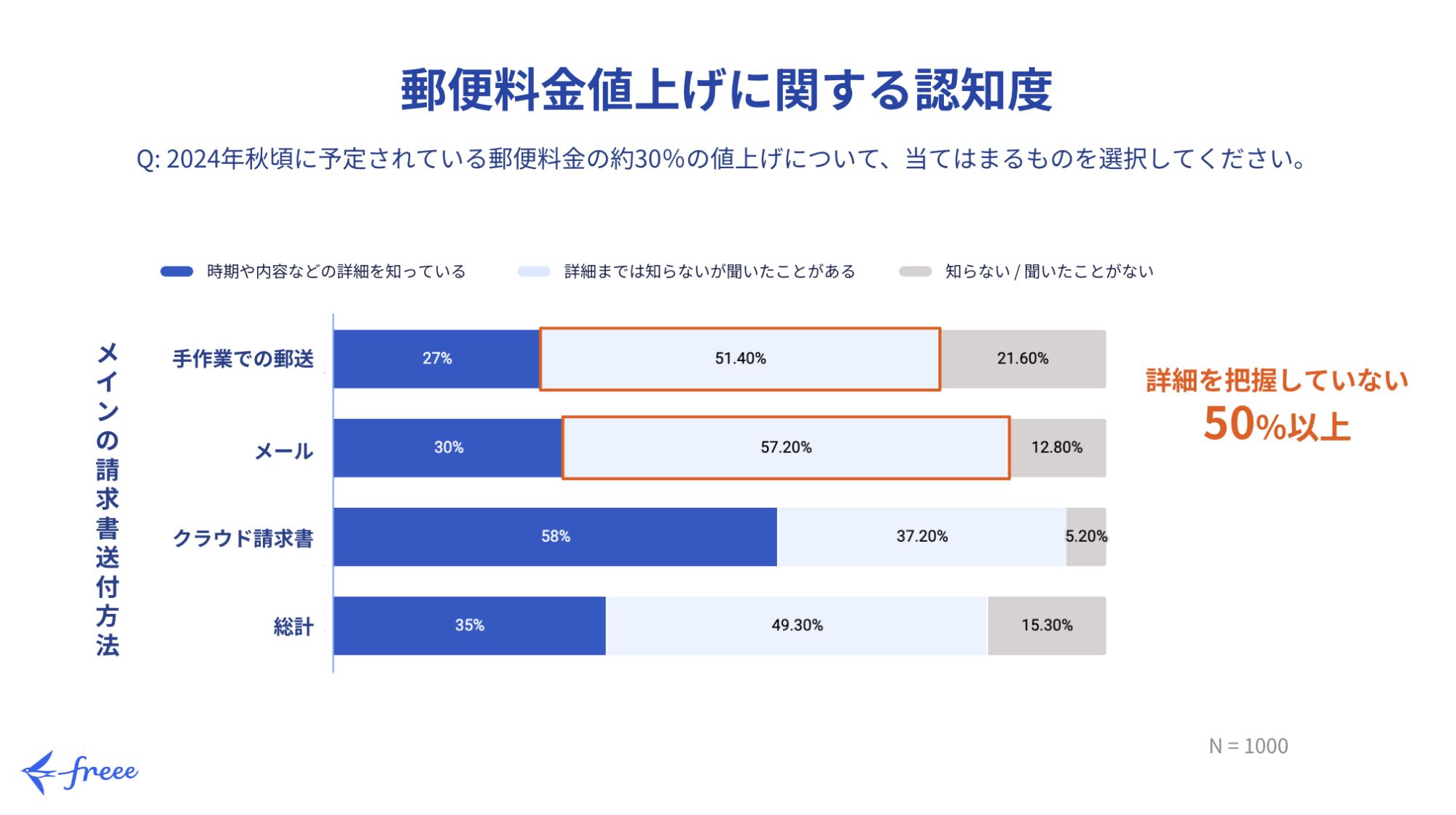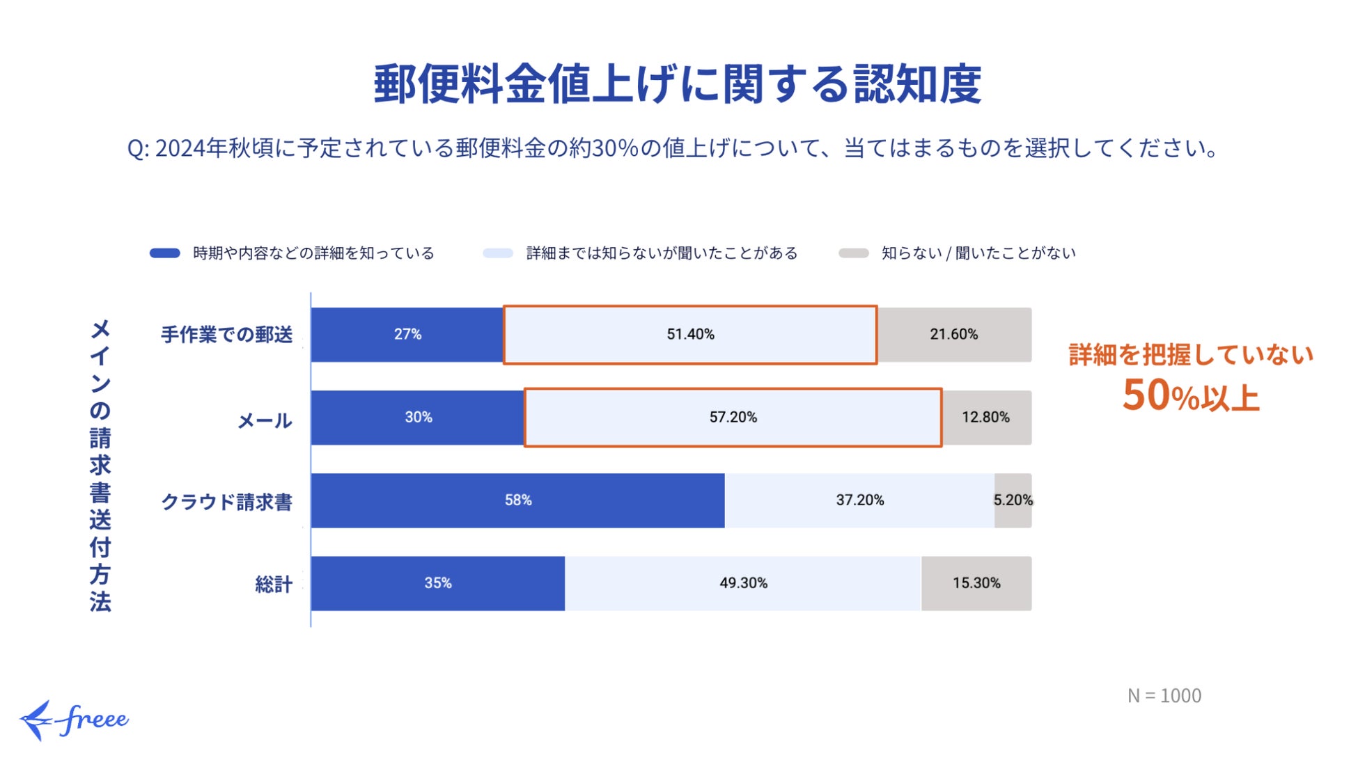 ・郵便料金値上げの認知度は8割程度と広まっているものの、請求書発行の中心がメールや手作業での郵送の企業のうち5割程度が値上げに関する内容の詳細を把握していないということがわかりました