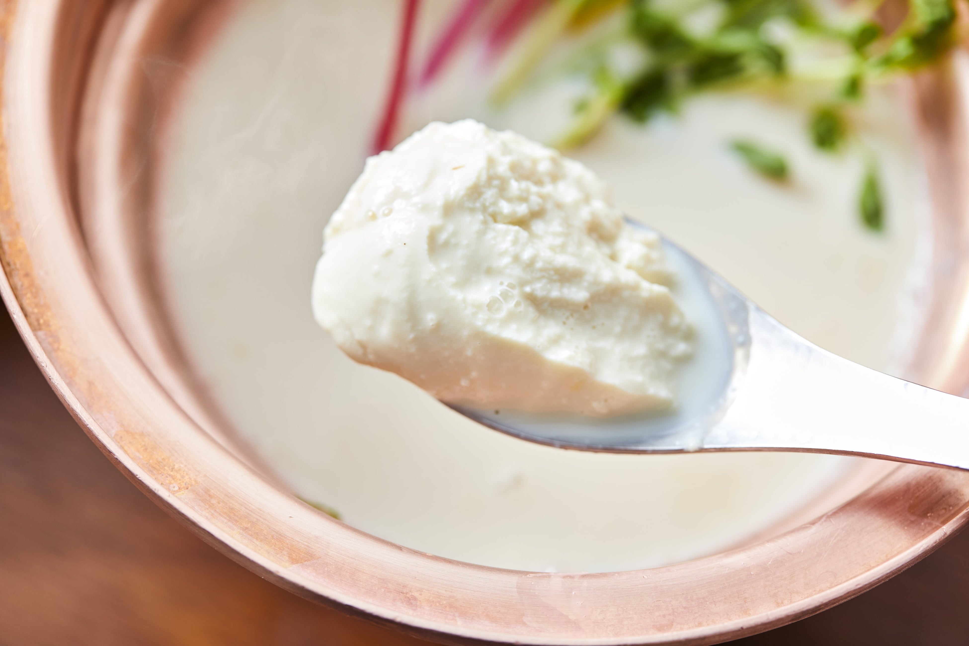 自家製の豆乳出汁におぼろ豆腐、湯葉を加えてお野菜をしゃぶしゃぶしてお召し上がりください。