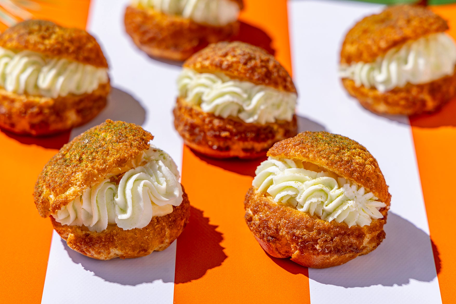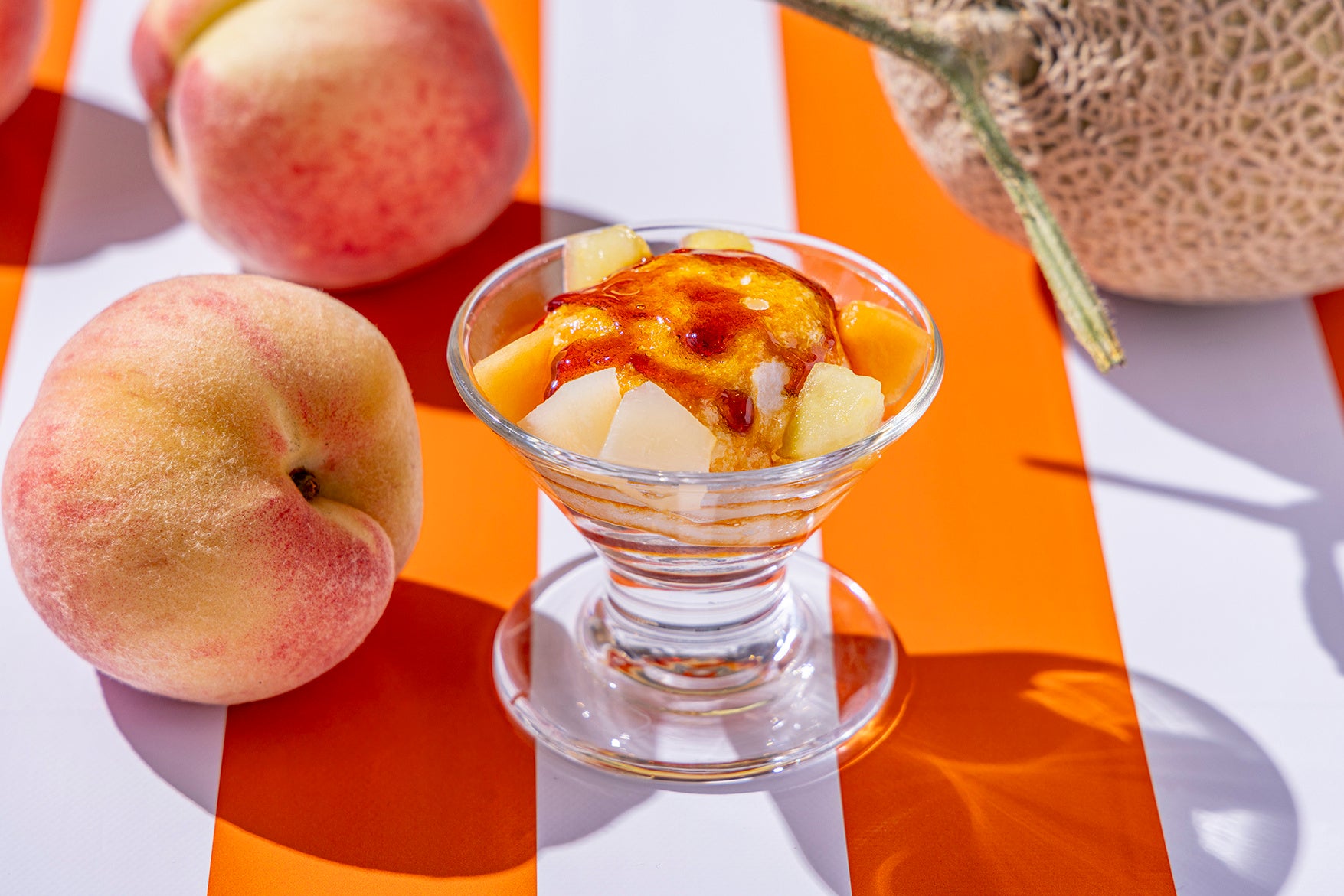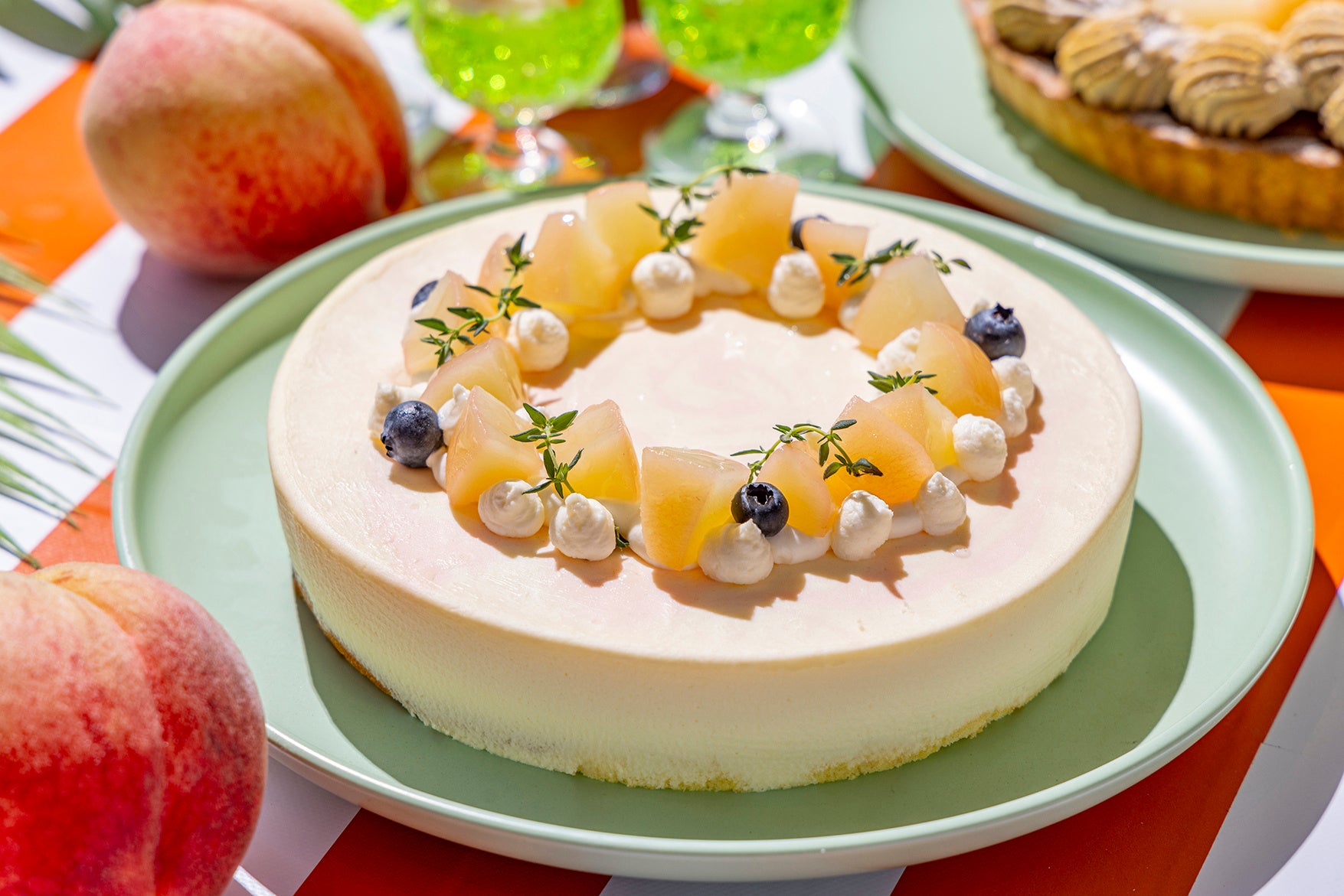 ライブパフォーマンスコーナーではフワフワなメレンゲにキャラメルソースとアングレーズソースをかけて、メロンと桃を添えて出来立てをお召し上がりいただく「ウフ・アラネージュ」をご用意しております。その他デザートは、生地にダイスカットした桃と紅茶の葉を練り込んだクリームを合わせた「桃とアールグレイのタルト」、シュー生地の上にクッキーをのせて焼き上げ、メロン果汁を加えたホイップクリームをつめた「メロンシュー」やメロンの果肉をたっぷりトッピングした「メロンショートケーキ」などメロンとピーチの果肉と果汁をたっぷり使った全15種がラインナップ。