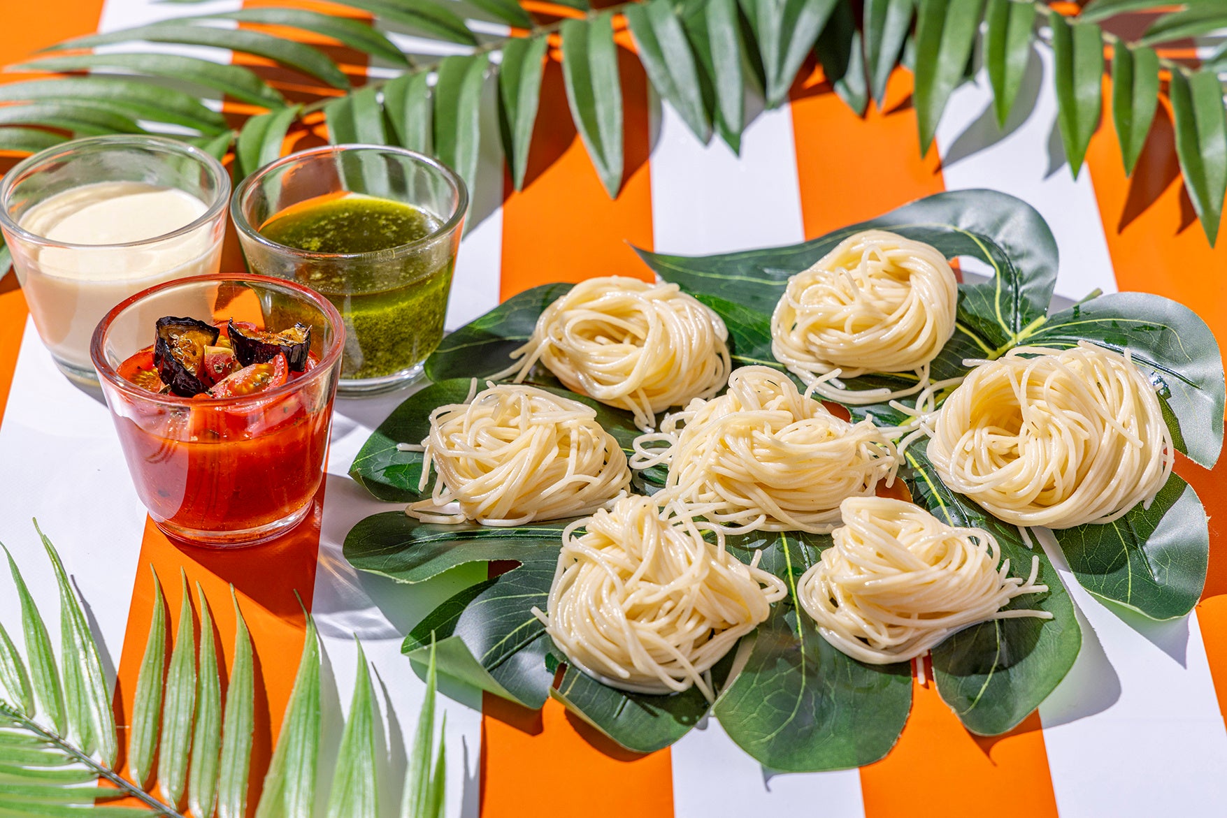 前菜からスープ、お肉、お魚料理、デザートまでコース仕立てで35種。夏の食材、トマト、バジルを使い、イタリアンの定番メニューをスパイシーに味付けし清涼感を表現した「夏のイタリアン」です。7月20日(土)~8月31日(土)の期間はレストランのテラスエリアに設置した竹樋にシェフがひとくちサイズのカッペリーニを流し、お好みのソースを掛けてお召し上がりいただく、夏休みイベントを開催します。エンタメ要素を取り入れた今回のイタリアンはお子様と一緒にお楽しみいただけます。見た目は「流しそうめん」ですが、イタリアン風にアレンジして細麺パスタ「カッペリーニ」にフレッシュトマトと茄子のオレガノソースやお子様向けに冷やしコーンポタージュ、女性に人気のジェノベーゼソースをたっぷりかけてお召し上がりください。