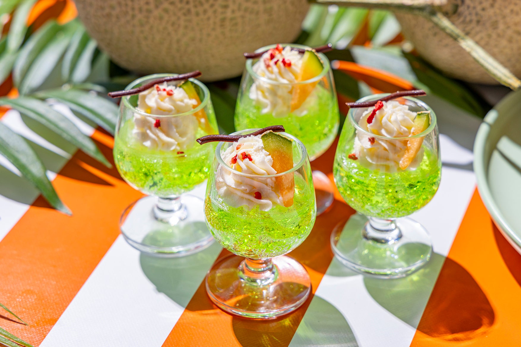 赤肉メロンのショートケーキ/ 桃とアールグレイのタルト/ 桃のレアチーズケーキ/メロンシュー/ココナッツと桃のヴェリーヌ/メロンソーダ風ゼリー/メロントライフル/桃と紅茶のパウンドケーキ/ティラミス /ウフ・アラネージュ/カットすいか/白玉あんみつ/パンケーキマシーン/バニラアイスクリーム/ピーチシャーベット/メロンシャーベットほか