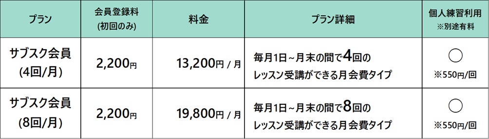 予約専用サイトより、ご希望のレッスン日時をご予約いただく完全予約制です。予約時間の1時間前までお客様ご自身で予約専用サイトからキャンセルが可能で、急な用事などが入ってしまった場合も1回分の費用を消化することなくキャンセル対応が可能で安心です。また、各人の通いたいペースにあわせて、月4回、月8回のプランをお選びいただけます。月の利用回数を超えてご利用されたい場合は1回あたり3,850円をお支払いいただければ追加での受講が可能です。※追加受講のサービスはオープン時の混雑状況によりサービス提供開始時期が異なります。