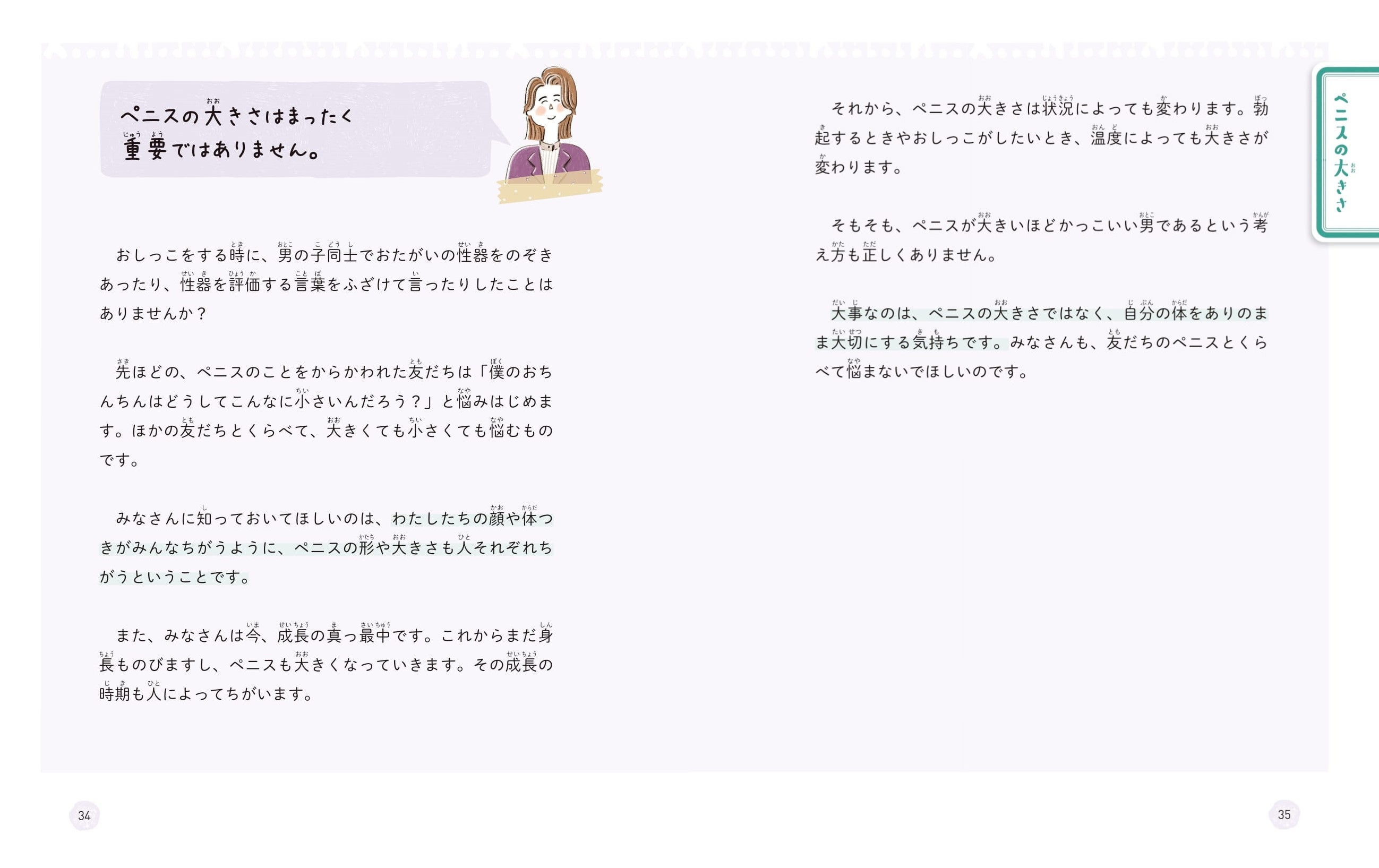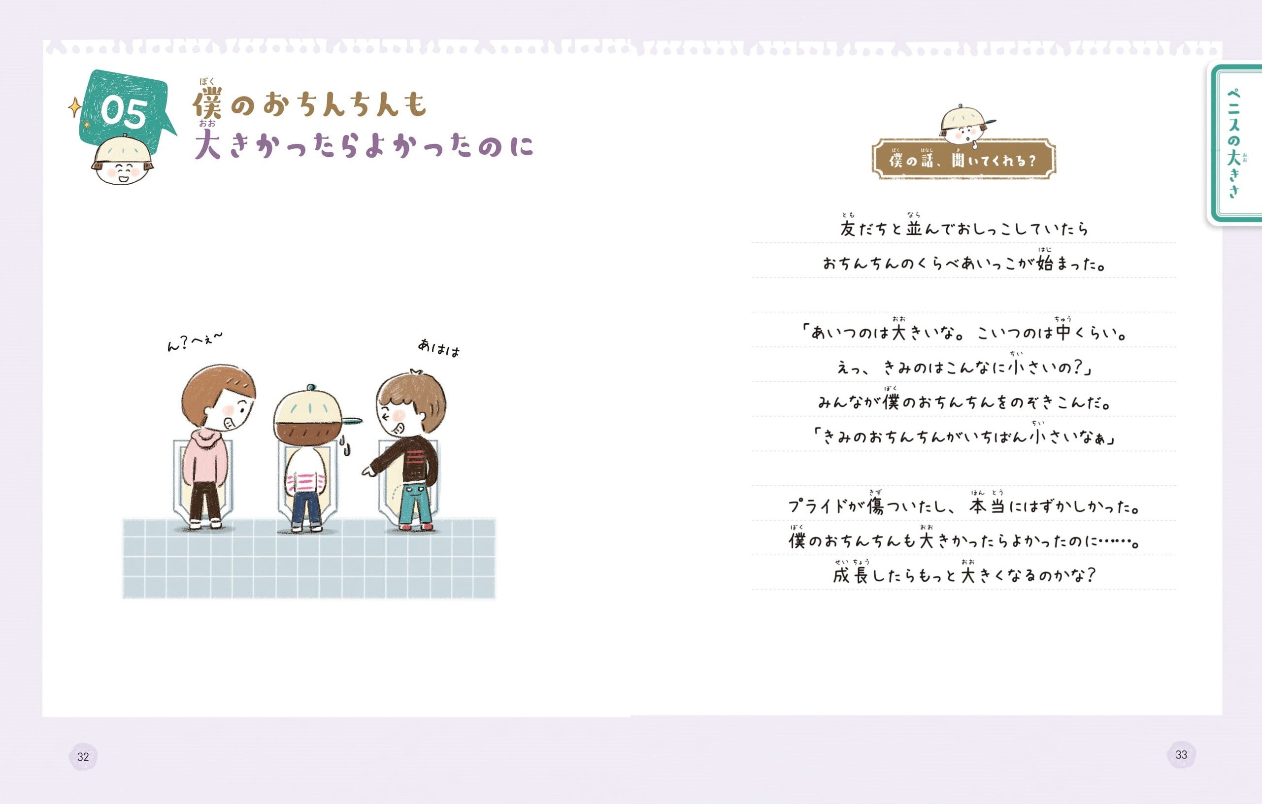 僕の体/ペニス/勃起/セルフプレジャー/ペニスの大きさ/包茎/おふろ/おふろに入る理由/妊娠/子宮/出産/双子/母乳/思春期/体毛/声がわり/射精と夢精/生理/好きという気持ち/思春期の心