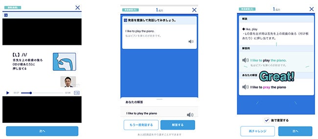 2. 動画視聴後に単語や文章の発音を実践。音声認識技術を用いたAIによる発話判定により、習熟度を確認することが可能