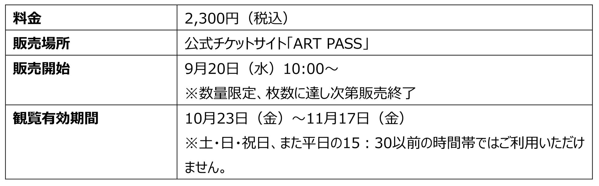 主なチケット販売場所:公式チケットサイト「ART PASS」、産経iD、フジテレビダイレクト、チケットぴあ、ローソンチケット、e+(イープラス)、CNプレイガイド、楽天チケット ほか
