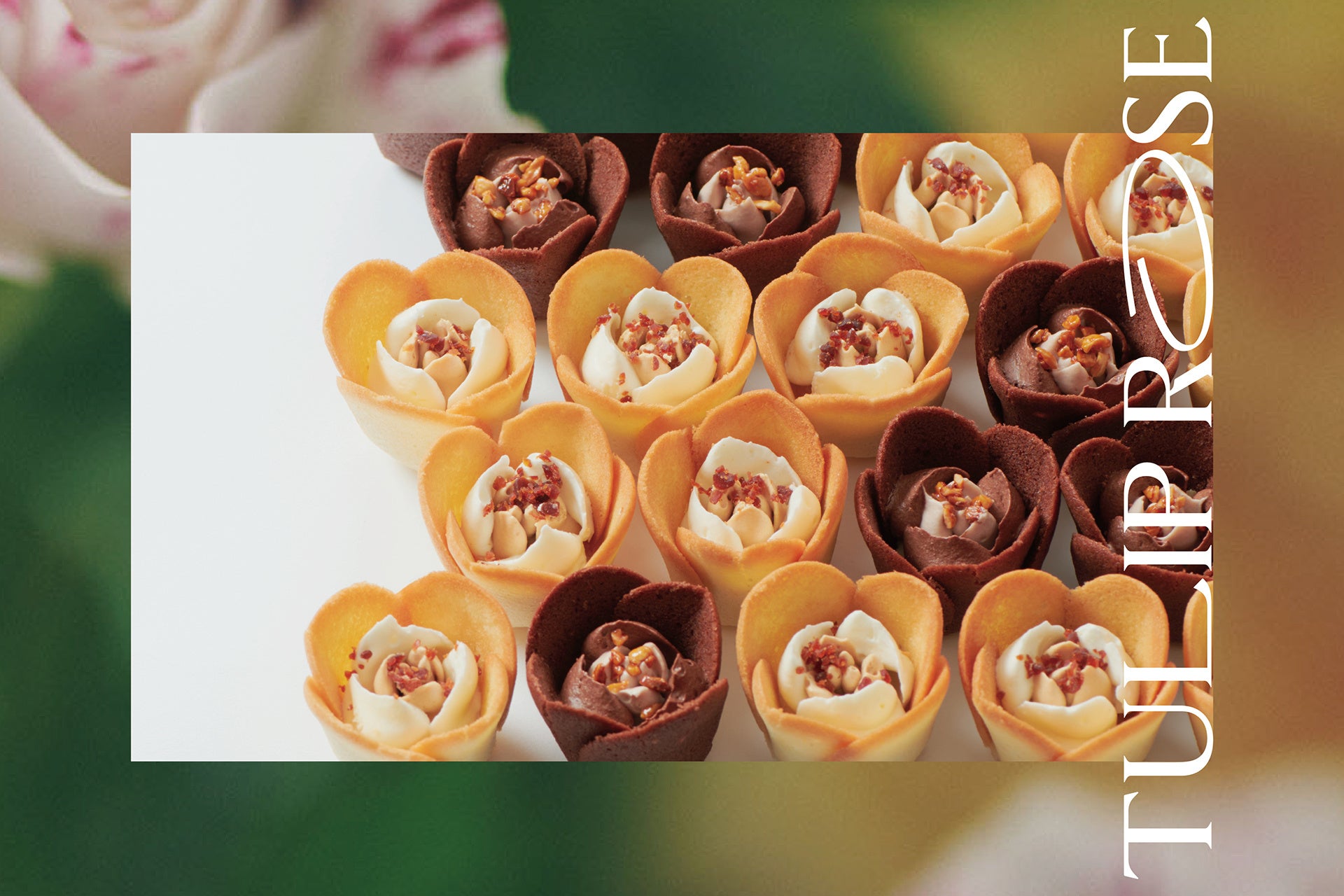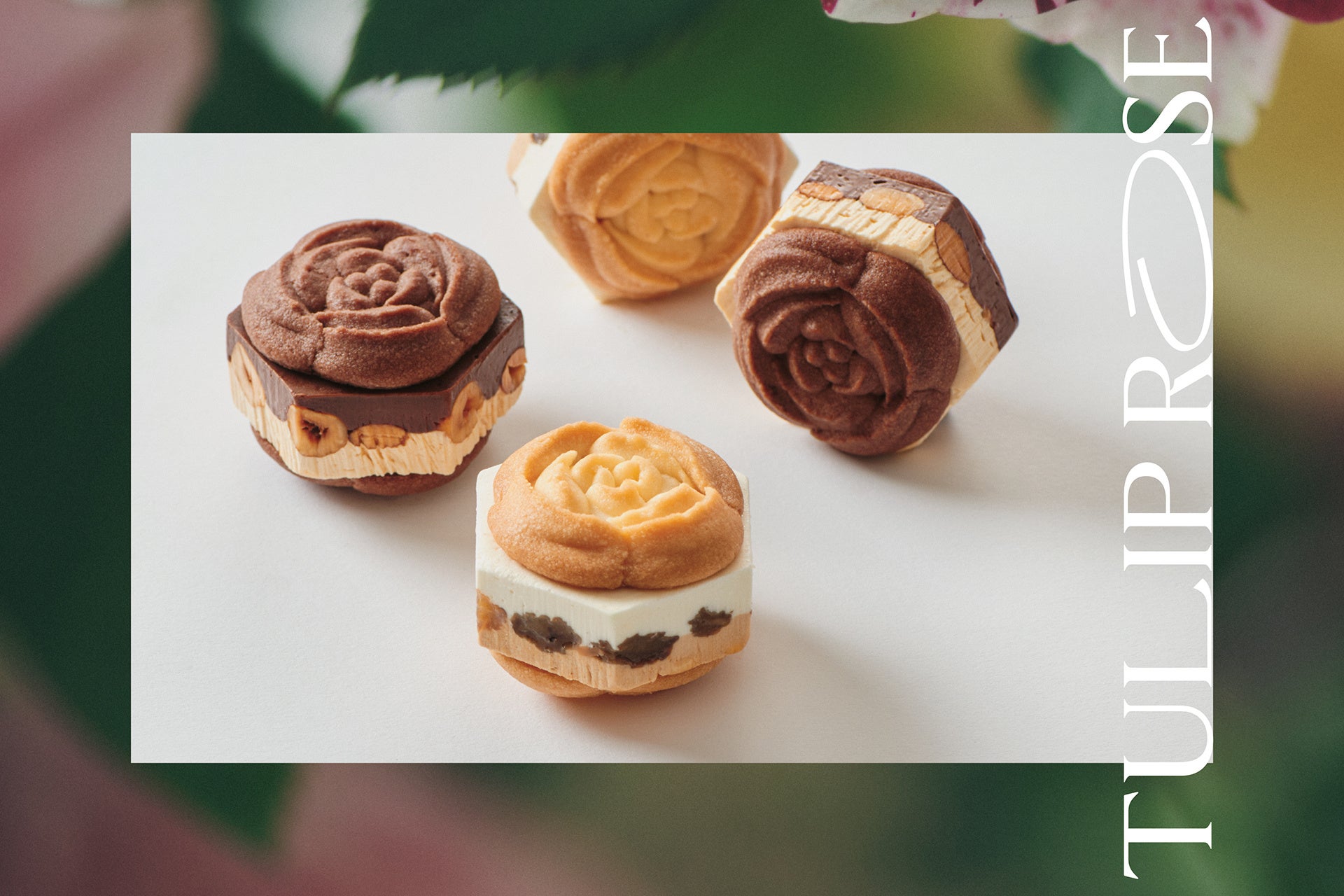 世界中から選び抜いた厳選素材で生まれ変わった代表作《チューリップローズ》の濃厚なコクや芳醇な美味しさはそのままに、ジューシーな味わいや多彩な食感を惜しみなく加えた贅沢2層重ね生仕立てにグレードアップさせました。仕上げに《チューリップローズ》を真上から眺めた姿をかたどった、美しいサブレにサンド。