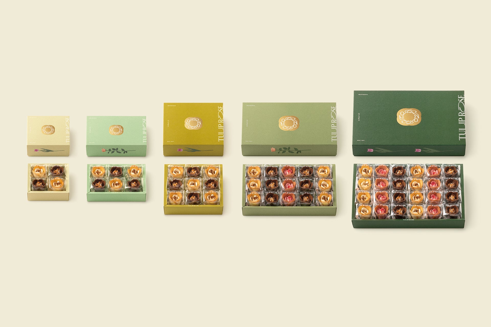 《チューリップローズ》のギフトボックスも、新デザインにスタイルアップ。ブランドの世界観を象徴するボタニカルグリーンの箱のサイドには、美しいチューリップとローズが一輪ずつ添えられています。ボックスサイズごとにグリーンのニュアンスが変化するのもお楽しみのひとつ。あなたのお気に入りはどのボックスですか。