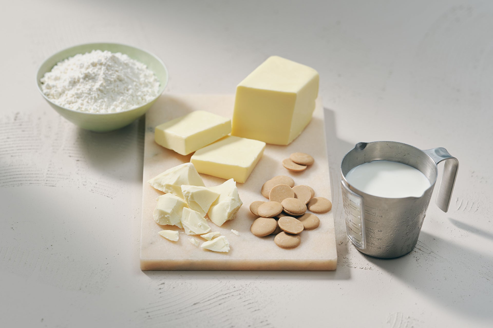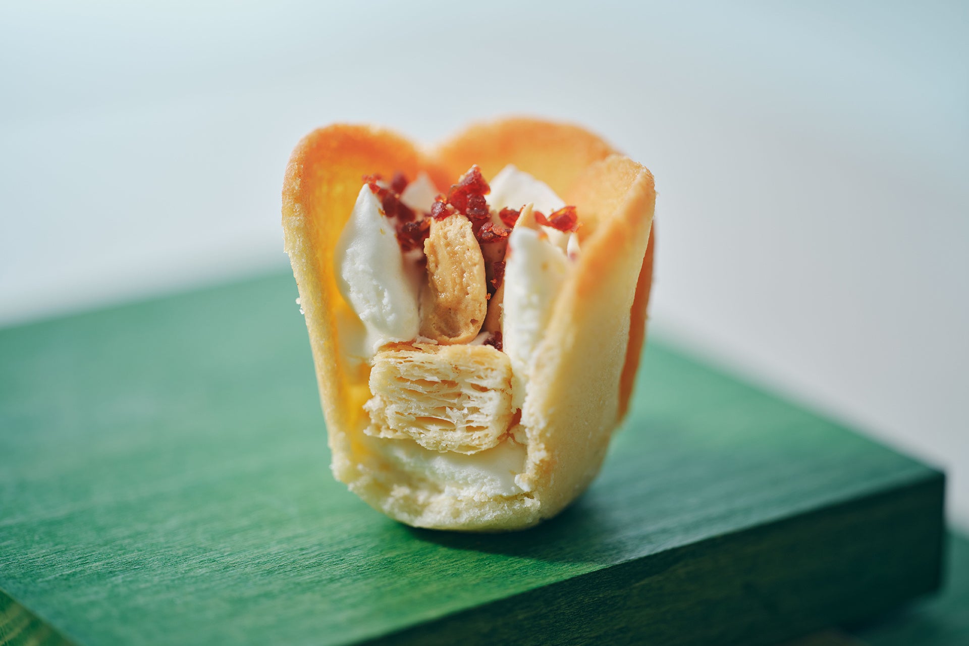 ミシュランシェフ御用達のブルターニュ産発酵バターを使用したラングドシャクッキーに、きめ細やかで軽い口どけに仕上げた2つのショコラクリームを絞りました。クリーミーさとコクをたっぷり味わえる北海道産ミルク仕立てのホワイトショコラクリーム。さらに、宮古島の雪塩が隠し味の香ばしい塩バターキャラメル風味のクリームでミルクのコクを深めています。ボトムに潜ませたパイの塩味もコクを引き締める名脇役です。