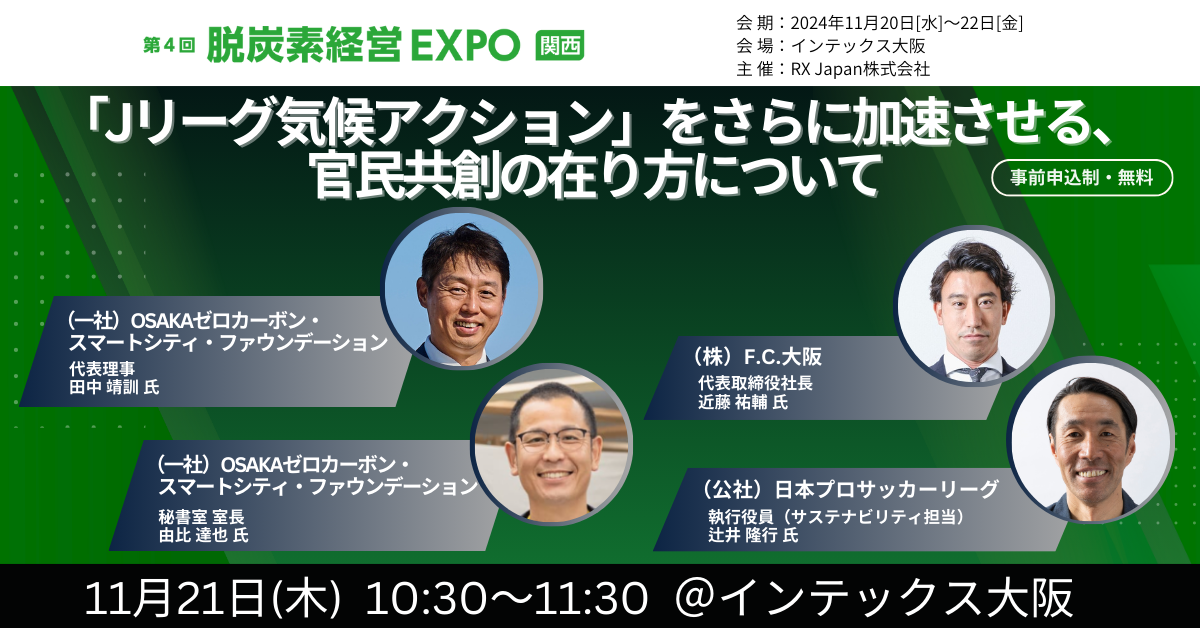11/20(水)に開幕する「スマートエネルギーWEEK【関西】・GX経営WEEK【関西】」。この中で連日開催される「カンファレンス」には、11/21(木)にOZCaF・Jリーグ・FC大阪が登壇!「Jリーグ気候アクション」をテーマに、地域社会と共創する「脱炭素社会」について語ります。